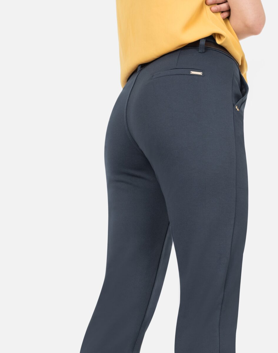 Spodnie model 8145 to klasyczne, bardzo eleganckie Chinosy damskie o wyszczuplającym optycznie kobiecą sylwetkę fasonie i wyższym stanie. Zapinane są na kryty zamek błyskawiczny i guzik sygnowany logiem firmy. Na bokach mają dwie skośne kieszonki, z tyłu imitacja kieszeni wpuszczanych. W pasie szlufki umożliwiające stylizacje z paskiem.