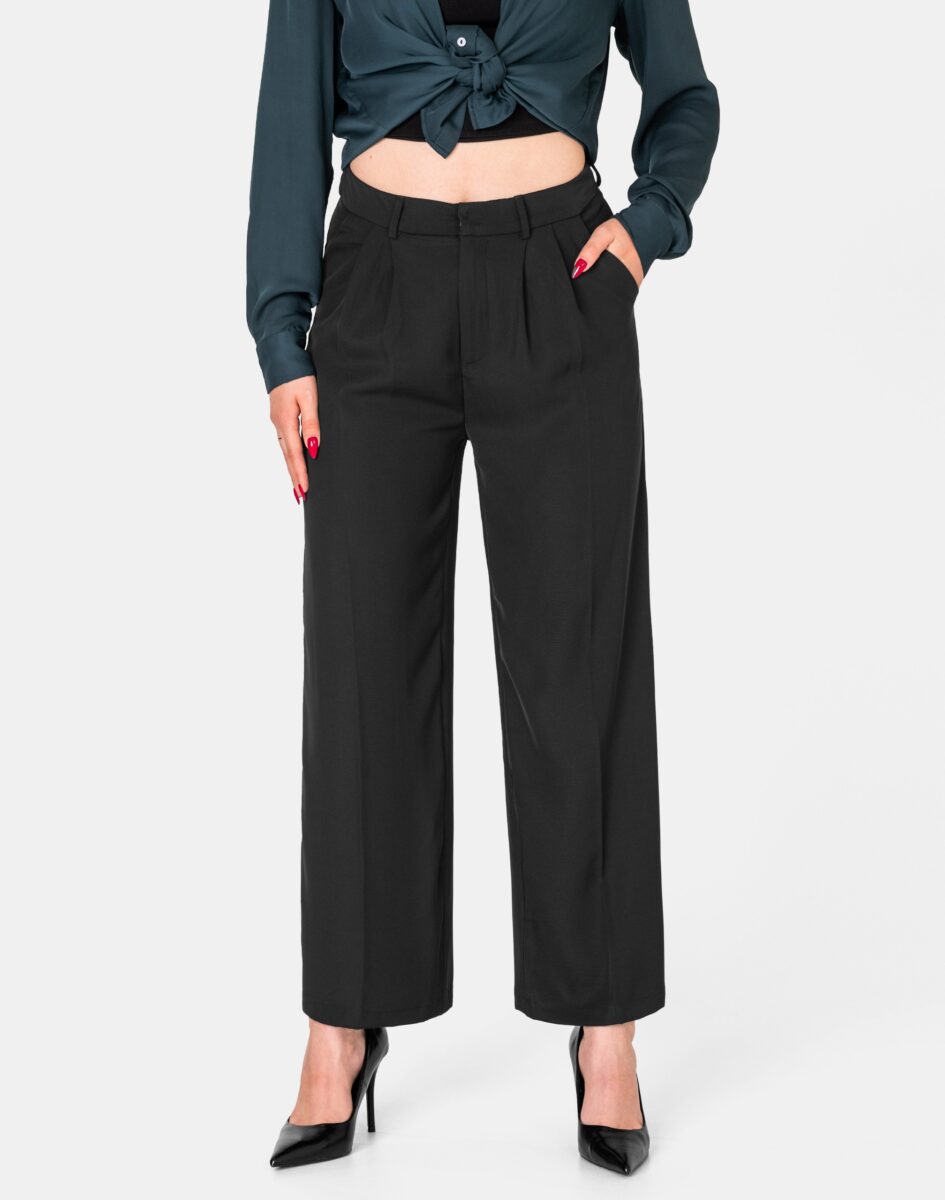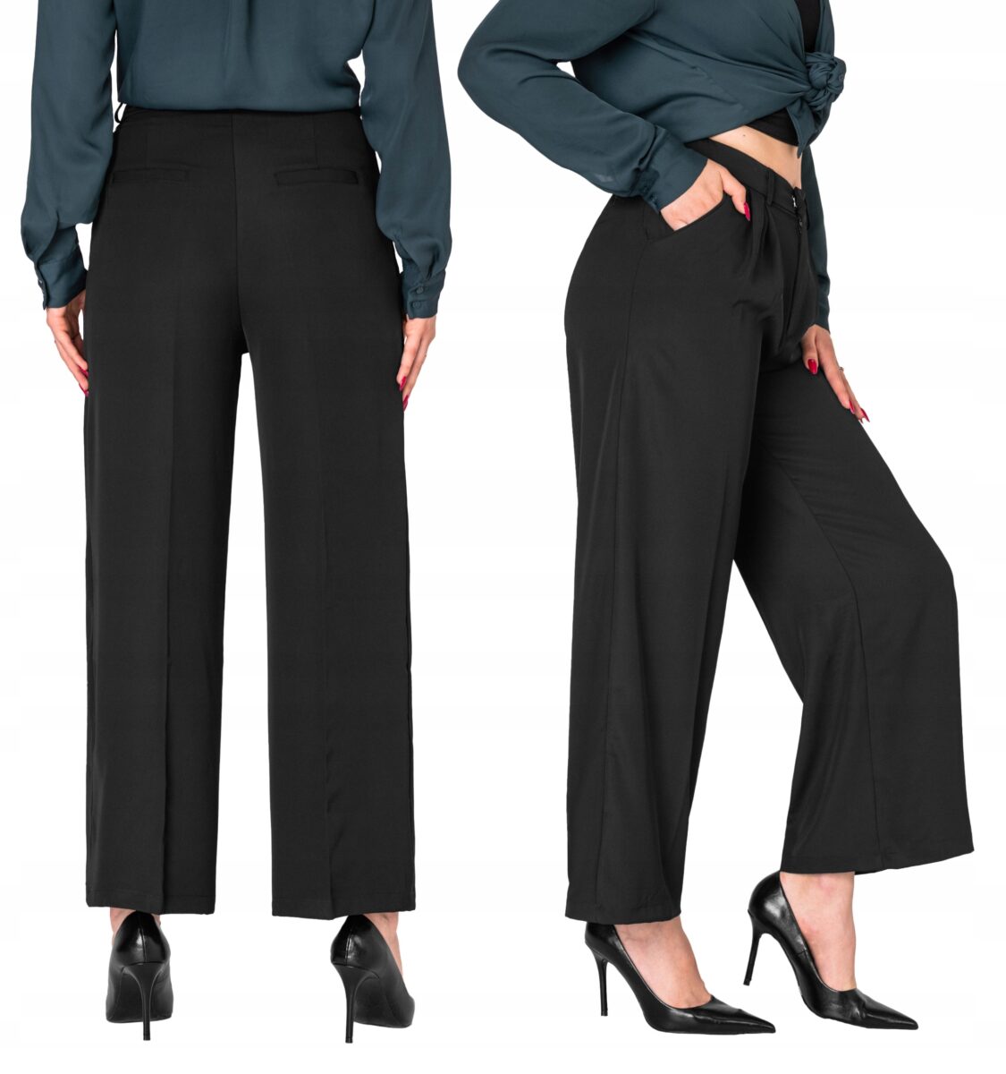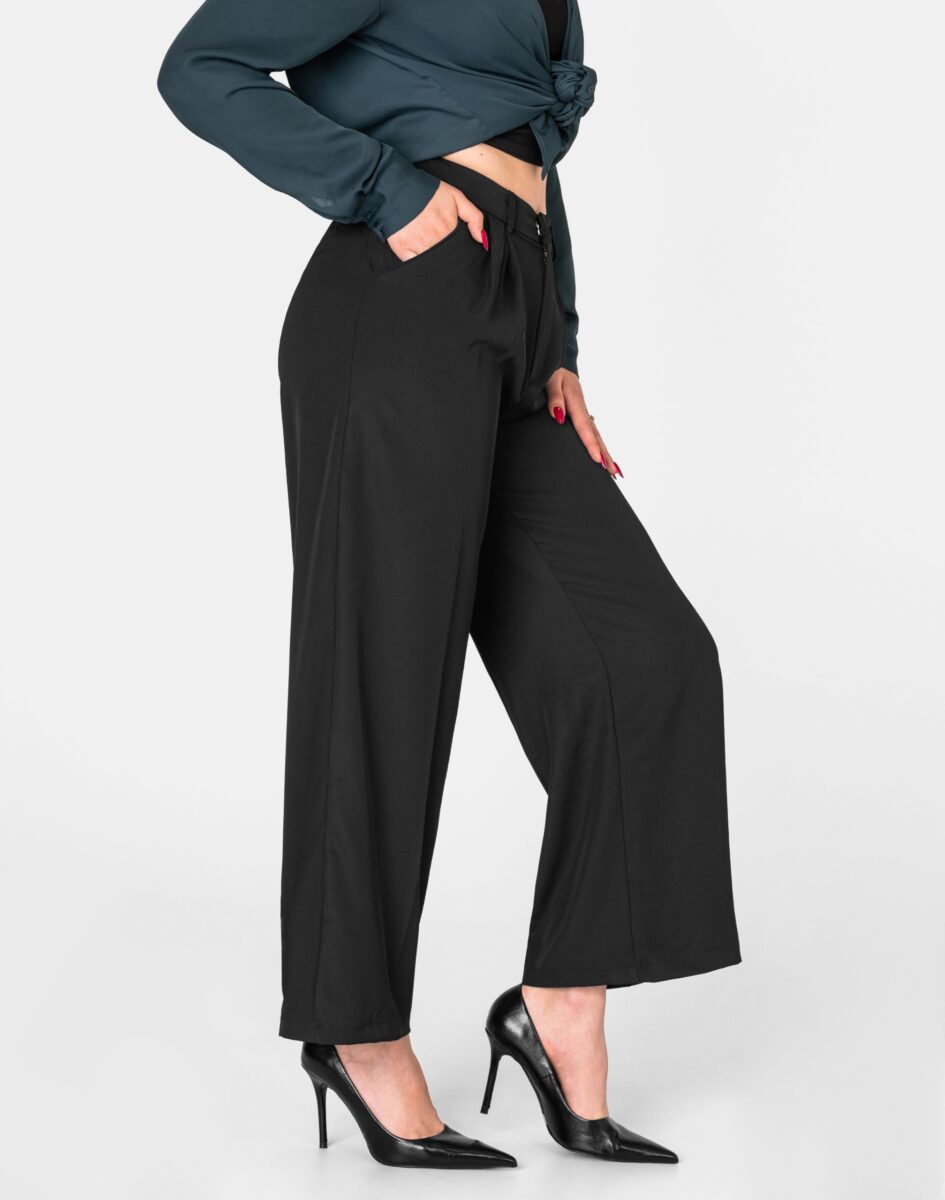 Eleganckie spodnie wizytowe model FG004# to powracające do łask spodnie damskie typu szwedy/dzwony wide leg w kolorze czarnym "Super Black", o charakterystycznych dla tego modelu nogawkach wide, rozszerzających się już od bioder. Uszyte z wysokiej jakości cienkiej tkaniny spodniowej, o drobnym zapewniającym dużą wytrzymałość splocie, odpornym na zużycie i odkształcanie dzięki czemu spodnie wyglądają jak nowe przez długie, długie lata. Są delikatnie elastyczne, nie gniotą się, ładnie dopasowują do sylwetki, i są bardzo komfortowe w użytkowaniu. Pozwalają na pełną swobodę ruchów, co daje wygodę przy siadaniu i zapewnia ogromny komfort noszenia. Najmodniejsze w tym sezonie szerokie, luźne nogawki typu szwedy, to doskonały pomysł na stylizację pozwalającą wyeksponować i podkreślić nogi, wyszczuplić sylwetkę oraz co bardzo ważne pięknie układają się w ruchu.