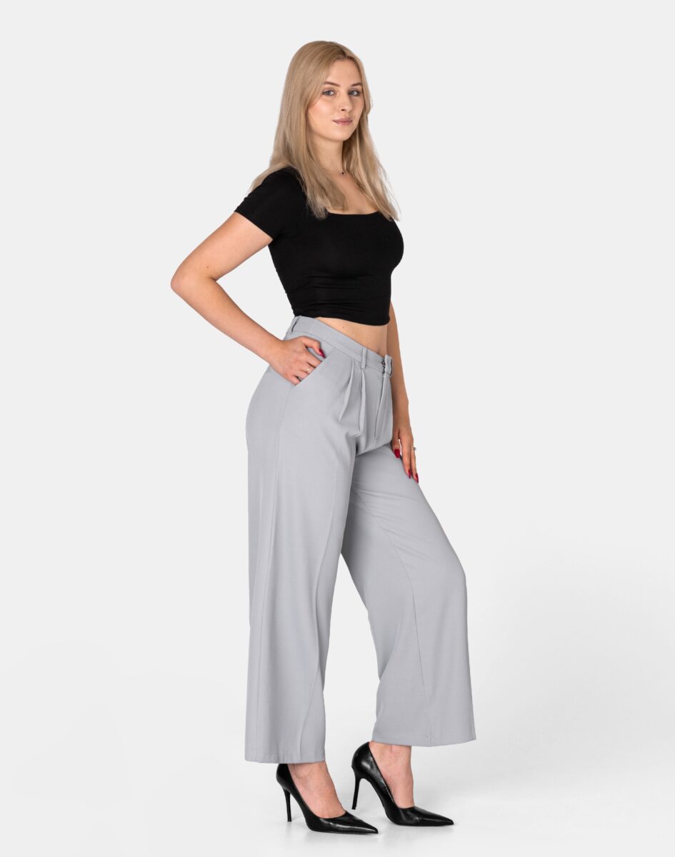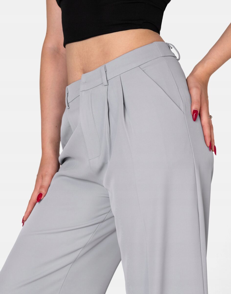Eleganckie spodnie wizytowe model FG004# to powracające do łask spodnie damskie typu szwedy/dzwony wide leg w kolorze popielatym "Light Gray", o charakterystycznych dla tego modelu nogawkach wide, rozszerzających się już od bioder. Uszyte z wysokiej jakości cienkiej tkaniny spodniowej, o drobnym zapewniającym dużą wytrzymałość splocie, odpornym na zużycie i odkształcanie dzięki czemu spodnie wyglądają jak nowe przez długie, długie lata. Są delikatnie elastyczne, nie gniotą się, ładnie dopasowują do sylwetki, i są bardzo komfortowe w użytkowaniu. Pozwalają na pełną swobodę ruchów, co daje wygodę przy siadaniu i zapewnia ogromny komfort noszenia. Najmodniejsze w tym sezonie szerokie, luźne nogawki typu szwedy, to doskonały pomysł na stylizację pozwalającą wyeksponować i podkreślić nogi, wyszczuplić sylwetkę oraz co bardzo ważne pięknie układają się w ruchu.