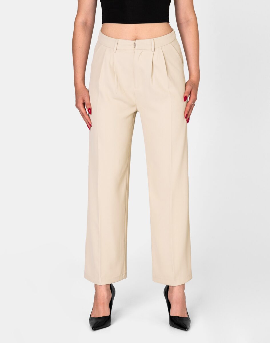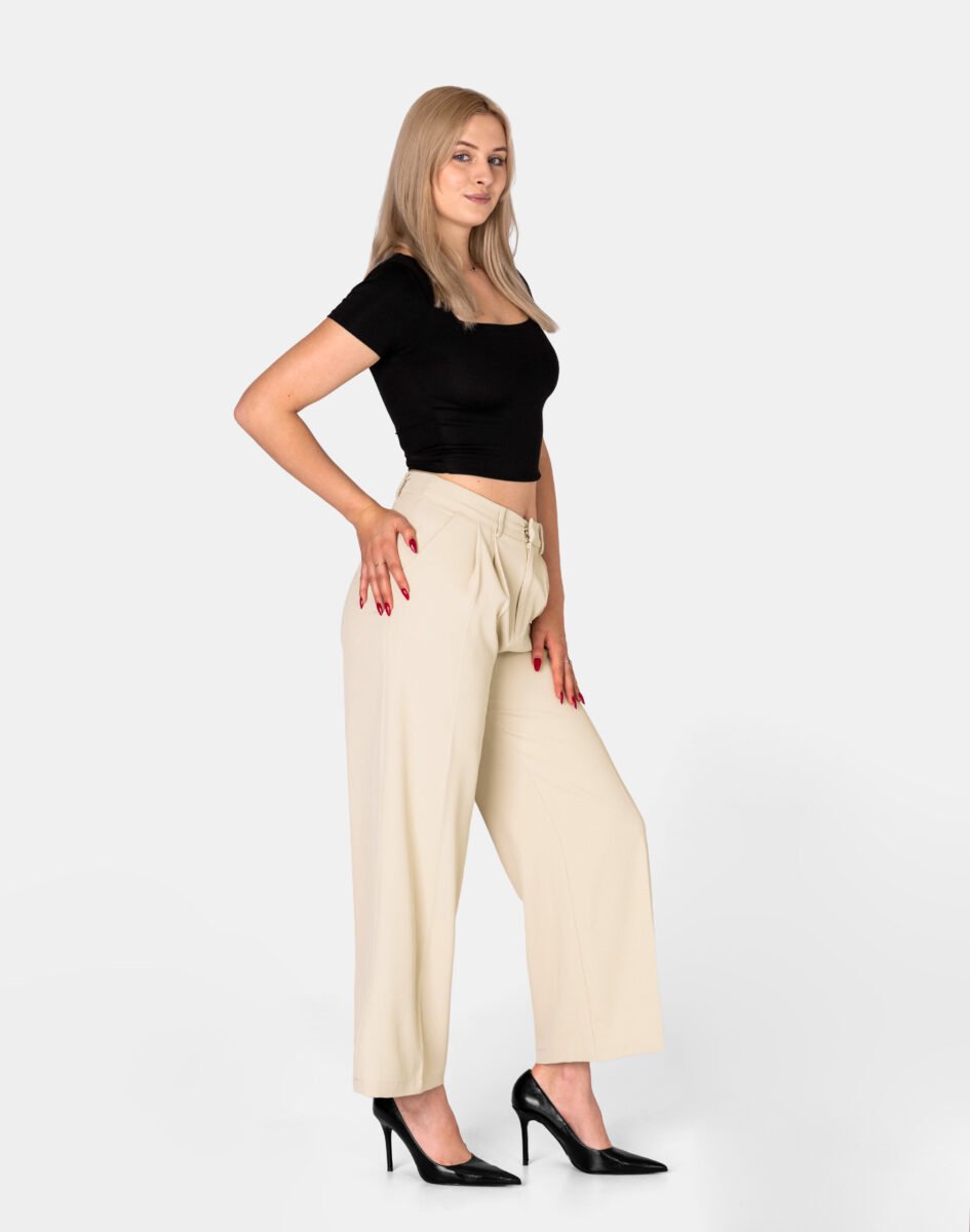 Eleganckie spodnie wizytowe model FG004# to powracające do łask spodnie damskie typu szwedy/dzwony wide leg w kolorze kremowym "Light Beige", o charakterystycznych dla tego modelu nogawkach wide, rozszerzających się już od bioder. Uszyte z wysokiej jakości cienkiej tkaniny spodniowej, o drobnym zapewniającym dużą wytrzymałość splocie, odpornym na zużycie i odkształcanie dzięki czemu spodnie wyglądają jak nowe przez długie, długie lata. Są delikatnie elastyczne, nie gniotą się, ładnie dopasowują do sylwetki, i są bardzo komfortowe w użytkowaniu. Pozwalają na pełną swobodę ruchów, co daje wygodę przy siadaniu i zapewnia ogromny komfort noszenia. Najmodniejsze w tym sezonie szerokie, luźne nogawki typu szwedy, to doskonały pomysł na stylizację pozwalającą wyeksponować i podkreślić nogi, wyszczuplić sylwetkę oraz co bardzo ważne pięknie układają się w ruchu.