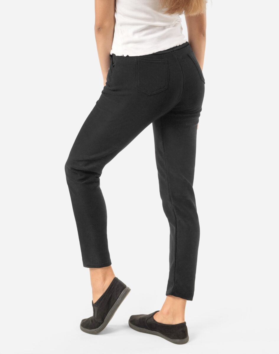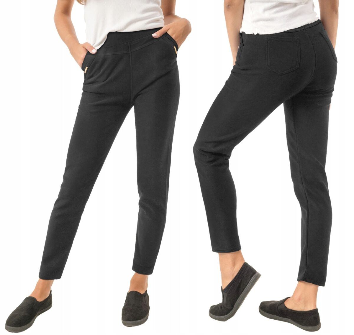 Ciepłe spodnie damskie bardzo szykowne cygaretki w stylu Glamour na jesień zimę z podwyższonym stanem i ocieplone od wewnętrznej strony sztucznym futerkiem. Z przodu mają dwie kieszenie wpuszczane na dłonie z tyłu dwie kieszonki naszywane. Dopasowanie w pasie zapewnia szeroki elastyczny pas ściągający zgrabnie modelujący sylwetkę w talii. Jak w typowych cygaretkach nogawka zwężana kończąca się na wysokości kostki dzięki temu sylwetka wygląda w nich lekko i zgrabnie. Oferowane przez nas spodnie są unikalnym połączeniem wysokiej jakości tkaniny bawełnianej z dodatkiem poliestru i spandexu, a od wewnątrz bardzo ciepłego i przyjemnego w kontakcie ze skórą sztucznego futerka. Dodatek spandexu sprawia że spodnie są bardziej elastyczne co pozwala na pełną swobodę ruchów, daje komfort przy siadaniu i zapewnia ogromny komfort noszenia. Warstwa wewnętrzna spodni wykonana z ciepłego futerka ma za zadanie zapewnić oddychalność i maksymalną ochronę w zmiennych warunkach i niskiej temperaturze. Takie wykończenie wewnętrznej strony spodni zapewnia bardzo wysoki wskaźnik ochrony termicznej, jak również zdecydowanie podnosi komfort użytkowania tych spodni jesienią a zwłaszcza zimą. Spodnie są przez to bardzo ciepłe, wygodne i oddychające (utrzymują ciepły i suchy mikroklimat skóry), a jednocześnie wyjątkowo lekkie.