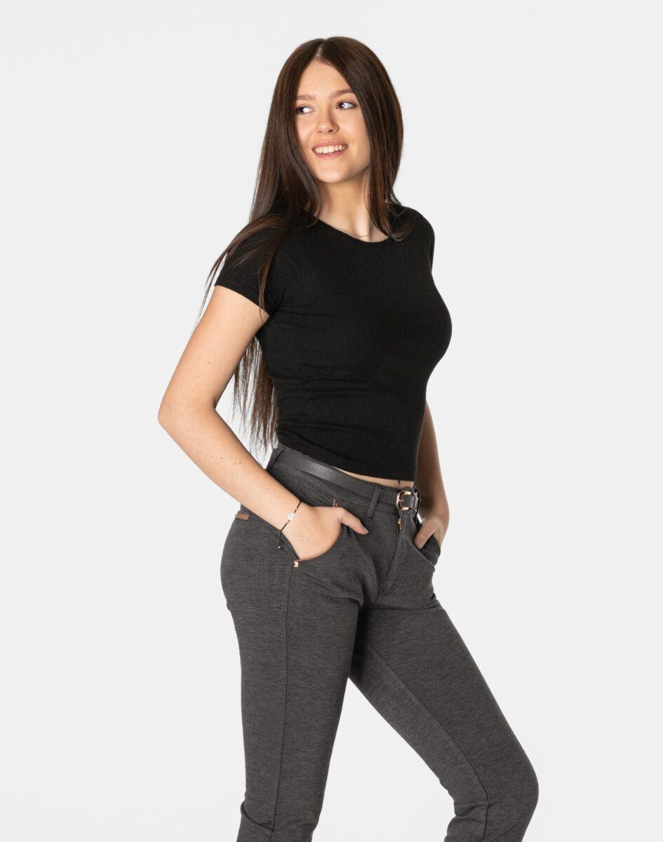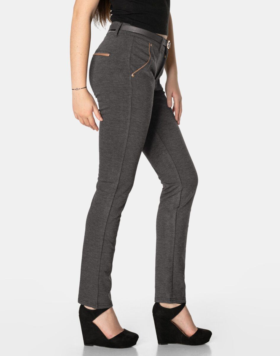 Spodnie damskie typu Chino zwane również Chinosami to klasyka wśród klasyki. Jeśli jeszcze nie masz w swojej szafie Chinosów, to jak najszybciej powinnaś naprawić to modowe niedopatrzenie. Dedykowane kobietom uwielbiającym elegancki i modny wygląd a jednocześnie sportowy charakter. Uszyte z wysokiej jakości, trwałej i mocnej, delikatnie elastycznej tkaniny bawełnianej średniej grubości o drobnym zapewniającym dużą wytrzymałość splocie. Niewielki dodatek elastanu (lycra) sprawia, że spodnie są bardziej elastyczne, dobrze dopasowują się do sylwetki, i są bardzo komfortowe w użytkowaniu. Łatwo się je zakłada i są znacznie wygodniejsze od Chinosów, które lycry nie mają. Poza tym bawełna ma tendencję do kurczenia się w praniu, dlatego lycra sprawia, że spodnie są wyjątkowo praktyczne i można je bez problemu założyć po wysuszeniu. Pozwalają na pełną swobodę ruchów, co daje wygodę przy siadaniu i zapewnia ogromny komfort noszenia. Zapinane na kryty zamek błyskawiczny i guzik, posiadają charakterystyczne dla Chinosów dwie skośne kieszenie na dłonie i dwie wpuszczane kieszenie wpuszczane z tyłu spodni. W pasie szlufki umożliwiające stylizacje z paskiem. Jak w typowych Chinosach nogawka lekko zwężana, nie zaprasowana na kant, kończąca się na wysokości kostki, co sprawia że sylwetka wygląda w nich lekko i zgrabnie.
