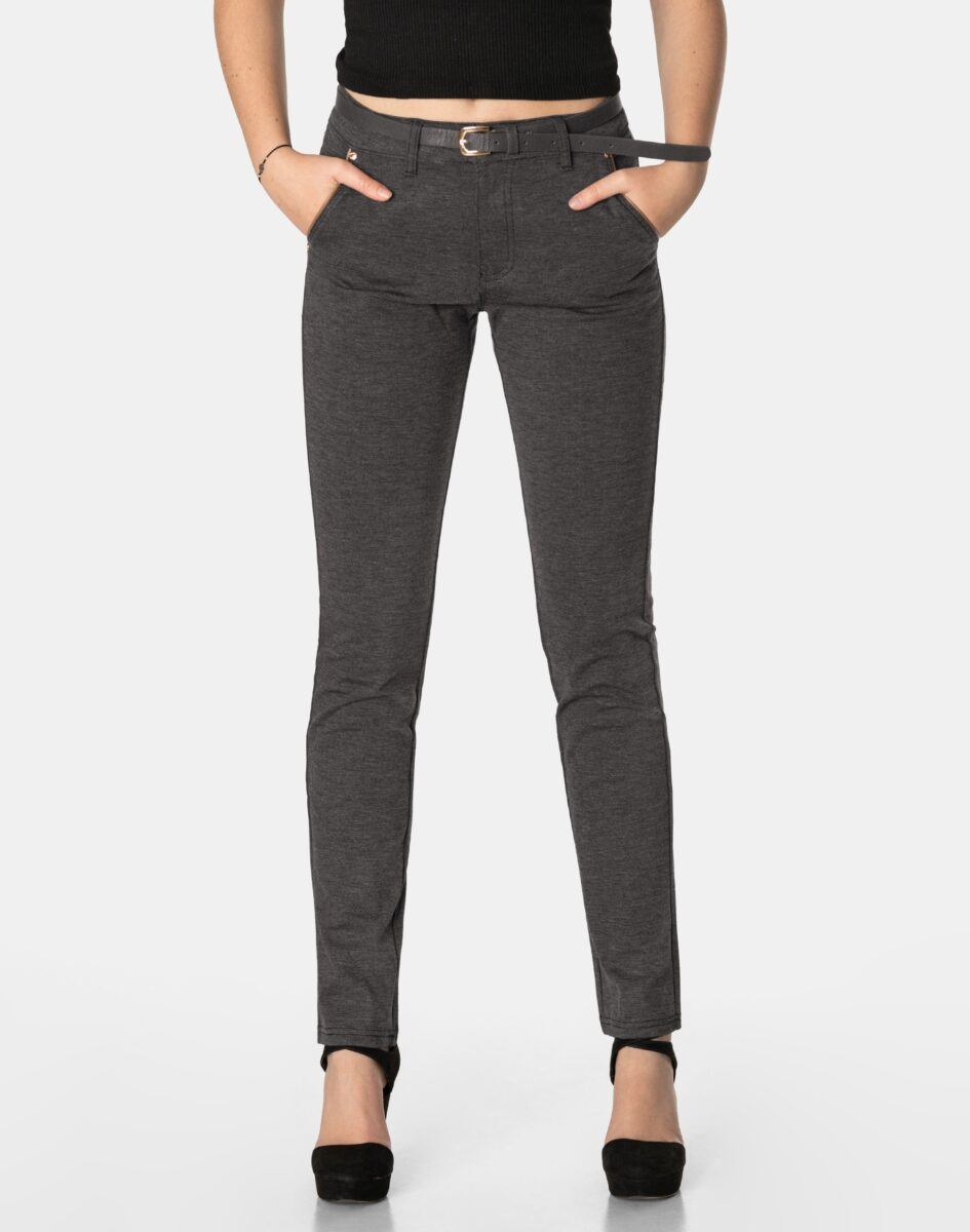 Spodnie damskie typu Chino zwane również Chinosami to klasyka wśród klasyki. Jeśli jeszcze nie masz w swojej szafie Chinosów, to jak najszybciej powinnaś naprawić to modowe niedopatrzenie. Dedykowane kobietom uwielbiającym elegancki i modny wygląd a jednocześnie sportowy charakter. Uszyte z wysokiej jakości, trwałej i mocnej, delikatnie elastycznej tkaniny bawełnianej średniej grubości o drobnym zapewniającym dużą wytrzymałość splocie. Niewielki dodatek elastanu (lycra) sprawia, że spodnie są bardziej elastyczne, dobrze dopasowują się do sylwetki, i są bardzo komfortowe w użytkowaniu. Łatwo się je zakłada i są znacznie wygodniejsze od Chinosów, które lycry nie mają. Poza tym bawełna ma tendencję do kurczenia się w praniu, dlatego lycra sprawia, że spodnie są wyjątkowo praktyczne i można je bez problemu założyć po wysuszeniu. Pozwalają na pełną swobodę ruchów, co daje wygodę przy siadaniu i zapewnia ogromny komfort noszenia. Zapinane na kryty zamek błyskawiczny i guzik, posiadają charakterystyczne dla Chinosów dwie skośne kieszenie na dłonie i dwie wpuszczane kieszenie wpuszczane z tyłu spodni. W pasie szlufki umożliwiające stylizacje z paskiem. Jak w typowych Chinosach nogawka lekko zwężana, nie zaprasowana na kant, kończąca się na wysokości kostki, co sprawia że sylwetka wygląda w nich lekko i zgrabnie.