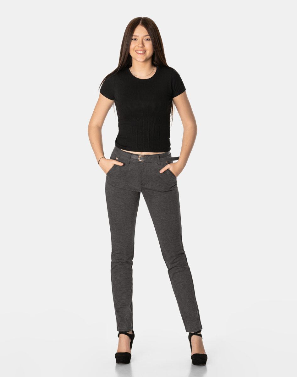 Spodnie damskie typu Chino zwane również Chinosami to klasyka wśród klasyki. Jeśli jeszcze nie masz w swojej szafie Chinosów, to jak najszybciej powinnaś naprawić to modowe niedopatrzenie. Dedykowane kobietom uwielbiającym elegancki i modny wygląd a jednocześnie sportowy charakter. Uszyte z wysokiej jakości, trwałej i mocnej, delikatnie elastycznej tkaniny bawełnianej średniej grubości o drobnym zapewniającym dużą wytrzymałość splocie. Niewielki dodatek elastanu (lycra) sprawia, że spodnie są bardziej elastyczne, dobrze dopasowują się do sylwetki, i są bardzo komfortowe w użytkowaniu. Łatwo się je zakłada i są znacznie wygodniejsze od Chinosów, które lycry nie mają. Poza tym bawełna ma tendencję do kurczenia się w praniu, dlatego lycra sprawia, że spodnie są wyjątkowo praktyczne i można je bez problemu założyć po wysuszeniu. Pozwalają na pełną swobodę ruchów, co daje wygodę przy siadaniu i zapewnia ogromny komfort noszenia. Zapinane na kryty zamek błyskawiczny i guzik, posiadają charakterystyczne dla Chinosów dwie skośne kieszenie na dłonie i dwie wpuszczane kieszenie wpuszczane z tyłu spodni. W pasie szlufki umożliwiające stylizacje z paskiem. Jak w typowych Chinosach nogawka lekko zwężana, nie zaprasowana na kant, kończąca się na wysokości kostki, co sprawia że sylwetka wygląda w nich lekko i zgrabnie.