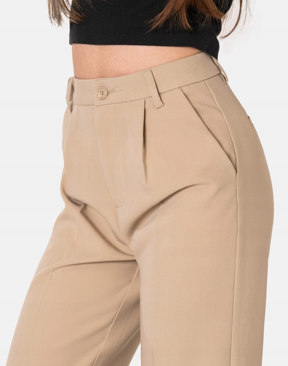 Mają luźny, prosty krój z podwyższoną talią i zapinane są na kryty zamek błyskawiczny i guzik. Z przodu mają dwie skośne kieszonki na dłonie, a z tyłu ozdobne atrapy kieszonek wpuszczanych. W pasie szlufki umożliwiające stylizacje z paskiem. Stan podwyższony "High Rise" zapewnia świetne dopasowanie i zgrabnie modeluje sylwetkę w talii. Spodnie z szerokimi nogawkami idealnie równoważą proporcje sylwetki i dzięki nieco ekstrawaganckiemu charakterowi sprawią, że nawet minimalistyczna stylizacja będzie prezentować się nietuzinkowo. Zaprezentują Cię jako osobę, która lubi czuć się wygodnie i uwielbia najnowsze trendy aby bawić się własnym stylem w modzie.
