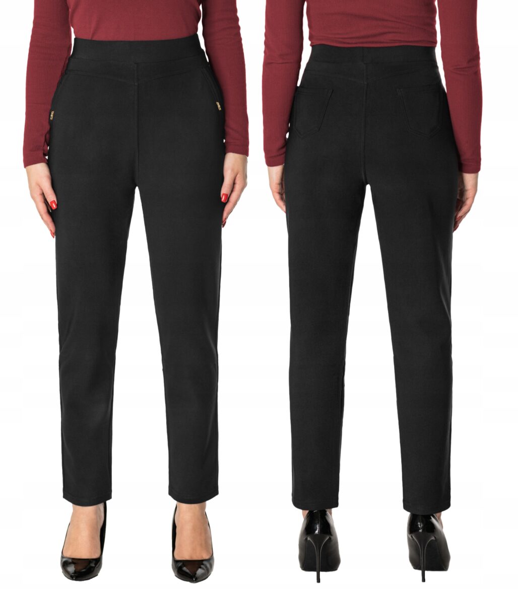 Wykonane z wysokiej jakości dzianiny bawełnianej średniej grubości z dodatkiem poliestru i elastanu (lycra) dzięki czemu spodnie są bardziej elastyczne, bardzo dobrze się układają i dopasowują do każdej figury. Pozwalają na pełną swobodę ruchów co daje komfort przy siadaniu i zapewnia ogromny komfort noszenia. Trwałe i elastyczne wykończenie spodni (użycie do produkcji elastycznych nici) gwarantuje komfort i wygodę ich użytkownikowi w każdych warunkach, a tkanina jest na tyle gruba, że nie widać przez nią bielizny. Sprawdzony przez wiele zadowolonych klientek uniwersalny i modny krój typu cygaretki z lekko zwężoną nogawką i wyższym stanem, które założysz na wiele różnych okazji. Ten prosty fason prezentuje się bardzo dobrze na wielu sylwetkach, dodając im lekkości (wystarczy do stroju dołożyć szpilki) i wysmuklając linię. Zbudujesz z nimi wiele zestawów, które będą wyglądały profesjonalnie i jednocześnie bardzo stylowo.