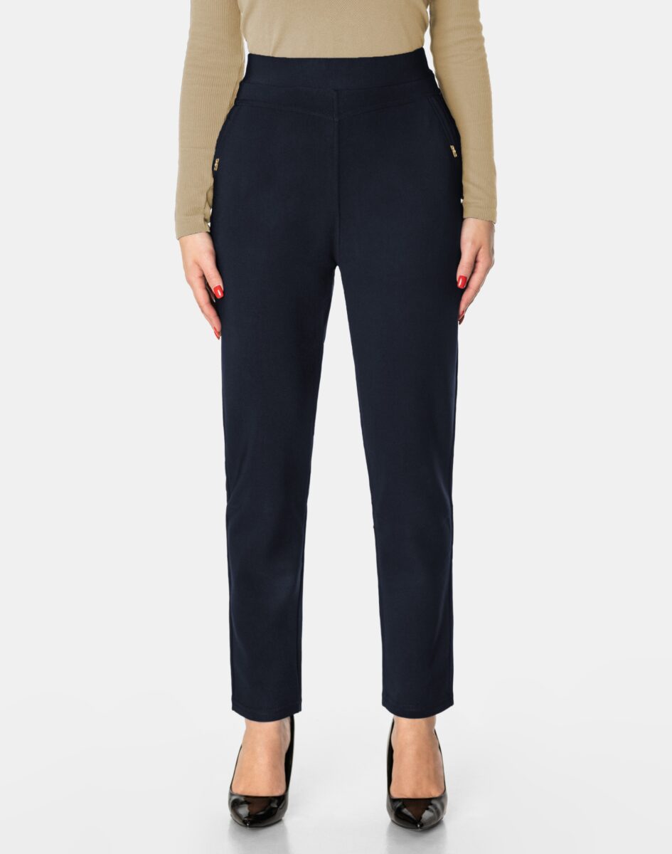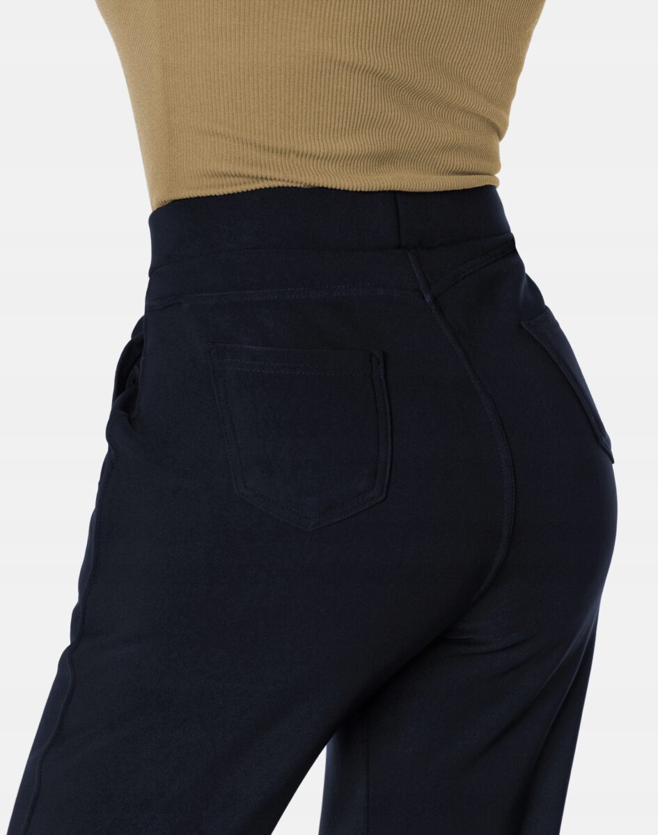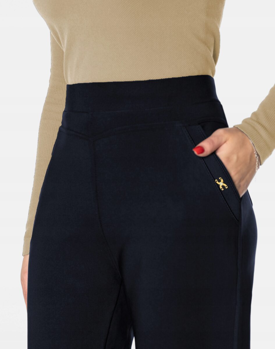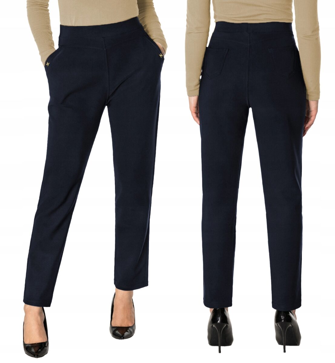 Wykonane z wysokiej jakości dzianiny bawełnianej średniej grubości z dodatkiem poliestru i elastanu (lycra) dzięki czemu spodnie są bardziej elastyczne, bardzo dobrze się układają i dopasowują do każdej figury. Pozwalają na pełną swobodę ruchów co daje komfort przy siadaniu i zapewnia ogromny komfort noszenia. Trwałe i elastyczne wykończenie spodni (użycie do produkcji elastycznych nici) gwarantuje komfort i wygodę ich użytkownikowi w każdych warunkach, a tkanina jest na tyle gruba, że nie widać przez nią bielizny. Sprawdzony przez wiele zadowolonych klientek uniwersalny i modny krój typu cygaretki z lekko zwężoną nogawką i wyższym stanem, które założysz na wiele różnych okazji. Ten prosty fason prezentuje się bardzo dobrze na wielu sylwetkach, dodając im lekkości (wystarczy do stroju dołożyć szpilki) i wysmuklając linię. Zbudujesz z nimi wiele zestawów, które będą wyglądały profesjonalnie i jednocześnie bardzo stylowo.
