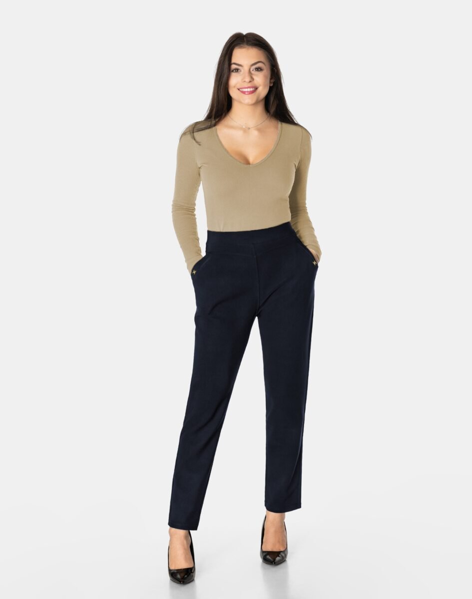 Wykonane z wysokiej jakości dzianiny bawełnianej średniej grubości z dodatkiem poliestru i elastanu (lycra) dzięki czemu spodnie są bardziej elastyczne, bardzo dobrze się układają i dopasowują do każdej figury. Pozwalają na pełną swobodę ruchów co daje komfort przy siadaniu i zapewnia ogromny komfort noszenia. Trwałe i elastyczne wykończenie spodni (użycie do produkcji elastycznych nici) gwarantuje komfort i wygodę ich użytkownikowi w każdych warunkach, a tkanina jest na tyle gruba, że nie widać przez nią bielizny. Sprawdzony przez wiele zadowolonych klientek uniwersalny i modny krój typu cygaretki z lekko zwężoną nogawką i wyższym stanem, które założysz na wiele różnych okazji. Ten prosty fason prezentuje się bardzo dobrze na wielu sylwetkach, dodając im lekkości (wystarczy do stroju dołożyć szpilki) i wysmuklając linię. Zbudujesz z nimi wiele zestawów, które będą wyglądały profesjonalnie i jednocześnie bardzo stylowo.