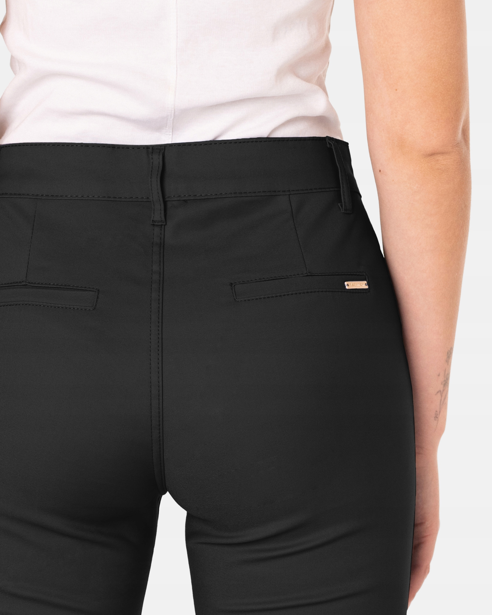 Spodnie damskie typu Chino zwane również Chinosami to klasyka wśród klasyki. Jeśli jeszcze nie masz w swojej szafie Chinosów, to jak najszybciej powinnaś naprawić to modowe niedopatrzenie. Dedykowane kobietom uwielbiającym elegancki i modny wygląd a jednocześnie sportowy charakter. Uszyte z wysokiej jakości, trwałej i mocnej, delikatnie elastycznej tkaniny bawełnianej średniej grubości o drobnym zapewniającym dużą wytrzymałość splocie. Niewielki dodatek spandexu (lycra) sprawia, że spodnie są bardziej elastyczne, dobrze dopasowują się do sylwetki, i są bardzo komfortowe w użytkowaniu. Łatwo się je zakłada i są znacznie wygodniejsze od Chinosów, które lycry nie mają. Poza tym bawełna ma tendencję do kurczenia się w praniu, dlatego lycra sprawia, że spodnie są wyjątkowo praktyczne i można je bez problemu założyć po wysuszeniu. Pozwalają na pełną swobodę ruchów, co daje wygodę przy siadaniu i zapewnia ogromny komfort noszenia. Zapinane na kryty zamek błyskawiczny i guzik, posiadają charakterystyczne dla Chinosów dwie skośne kieszenie na dłonie i imitację dwóch kieszeni wpuszczanych z tyłu spodni. W pasie szlufki umożliwiające stylizacje z paskiem. Jak w typowych Chinosach nogawka lekko zwężana, nie zaprasowana na kant, kończąca się na wysokości kostki, co sprawia że sylwetka wygląda w nich lekko i zgrabnie.
