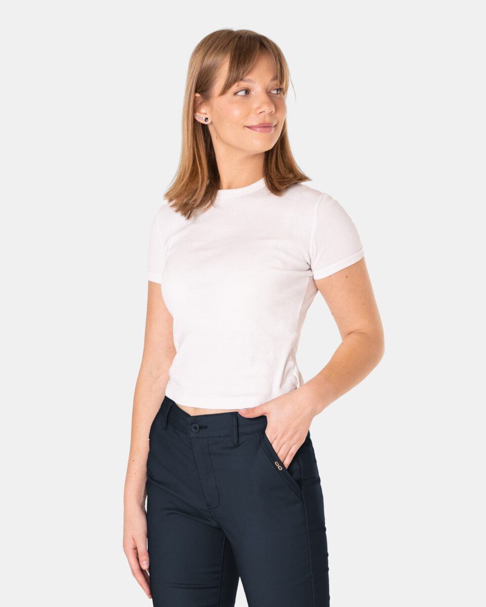 Spodnie damskie typu Chino zwane również Chinosami to klasyka wśród klasyki. Jeśli jeszcze nie masz w swojej szafie Chinosów, to jak najszybciej powinnaś naprawić to modowe niedopatrzenie. Dedykowane kobietom uwielbiającym elegancki i modny wygląd a jednocześnie sportowy charakter. Uszyte z wysokiej jakości, trwałej i mocnej, delikatnie elastycznej tkaniny bawełnianej średniej grubości o drobnym zapewniającym dużą wytrzymałość splocie. Niewielki dodatek spandexu (lycra) sprawia, że spodnie są bardziej elastyczne, dobrze dopasowują się do sylwetki, i są bardzo komfortowe w użytkowaniu. Łatwo się je zakłada i są znacznie wygodniejsze od Chinosów, które lycry nie mają. Poza tym bawełna ma tendencję do kurczenia się w praniu, dlatego lycra sprawia, że spodnie są wyjątkowo praktyczne i można je bez problemu założyć po wysuszeniu. Pozwalają na pełną swobodę ruchów, co daje wygodę przy siadaniu i zapewnia ogromny komfort noszenia. Zapinane na kryty zamek błyskawiczny i guzik, posiadają charakterystyczne dla Chinosów dwie skośne kieszenie na dłonie i imitację dwóch kieszeni wpuszczanych z tyłu spodni. W pasie szlufki umożliwiające stylizacje z paskiem. Jak w typowych Chinosach nogawka lekko zwężana, nie zaprasowana na kant, kończąca się na wysokości kostki, co sprawia że sylwetka wygląda w nich lekko i zgrabnie.