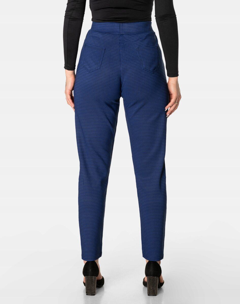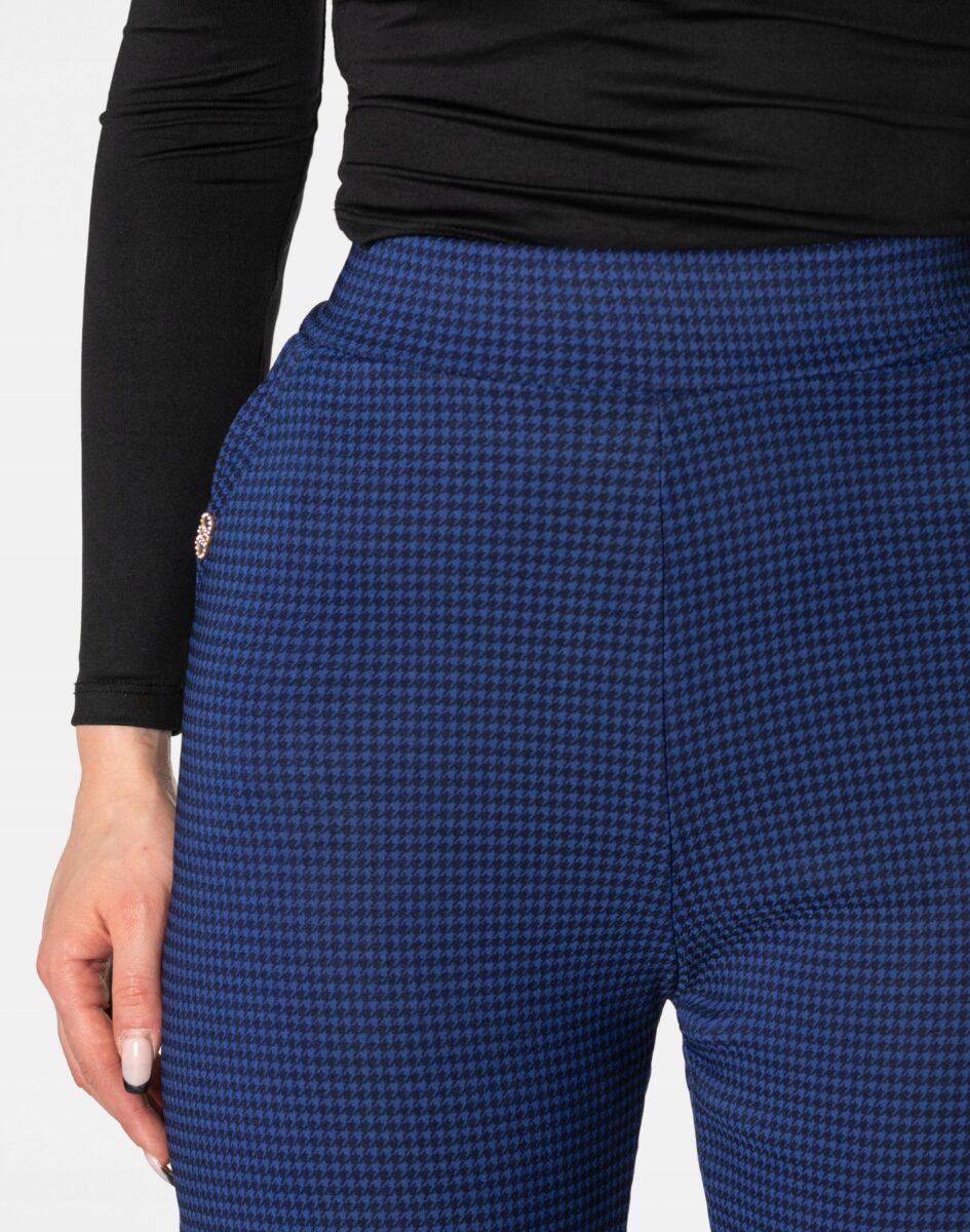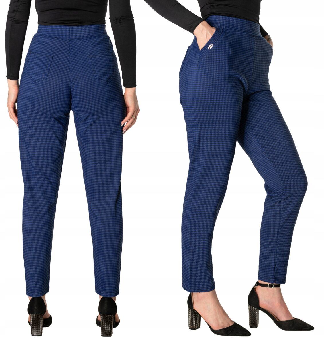 Wykonane z wysokiej jakości dzianiny średniej grubości z dodatkiem elastanu (lycra) dzięki czemu spodnie są bardziej elastyczne, bardzo dobrze się układają i dopasowują do każdej figury. Pozwalają na pełną swobodę ruchów co daje komfort przy siadaniu i zapewnia ogromny komfort noszenia. Trwałe i elastyczne wykończenie spodni (użycie do produkcji elastycznych nici) gwarantuje komfort i wygodę ich użytkownikowi w każdych warunkach, a tkanina jest na tyle gruba, że nie widać przez nią bielizny. Sprawdzony przez wiele zadowolonych klientek uniwersalny i modny krój typu cygaretki z lekko zwężoną nogawką i wyższym stanem, które założysz na wiele różnych okazji. Wzór pepitka uznawany kiedyś za symbol statusu i bogactwa, dziś niewątpliwie dodaje elegancji i jest kropką nad „i” udanej stylizacji.