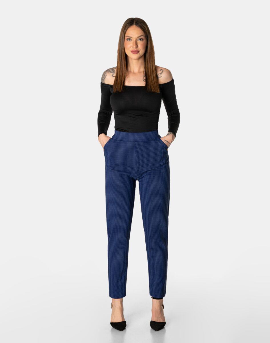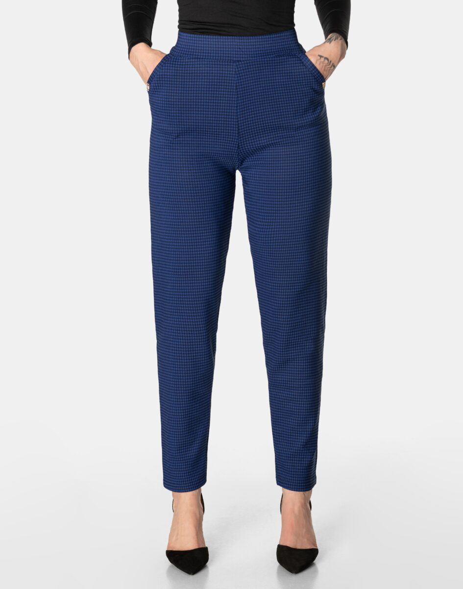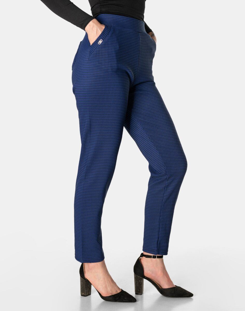 Wykonane z wysokiej jakości dzianiny średniej grubości z dodatkiem elastanu (lycra) dzięki czemu spodnie są bardziej elastyczne, bardzo dobrze się układają i dopasowują do każdej figury. Pozwalają na pełną swobodę ruchów co daje komfort przy siadaniu i zapewnia ogromny komfort noszenia. Trwałe i elastyczne wykończenie spodni (użycie do produkcji elastycznych nici) gwarantuje komfort i wygodę ich użytkownikowi w każdych warunkach, a tkanina jest na tyle gruba, że nie widać przez nią bielizny. Sprawdzony przez wiele zadowolonych klientek uniwersalny i modny krój typu cygaretki z lekko zwężoną nogawką i wyższym stanem, które założysz na wiele różnych okazji. Wzór pepitka uznawany kiedyś za symbol statusu i bogactwa, dziś niewątpliwie dodaje elegancji i jest kropką nad „i” udanej stylizacji.