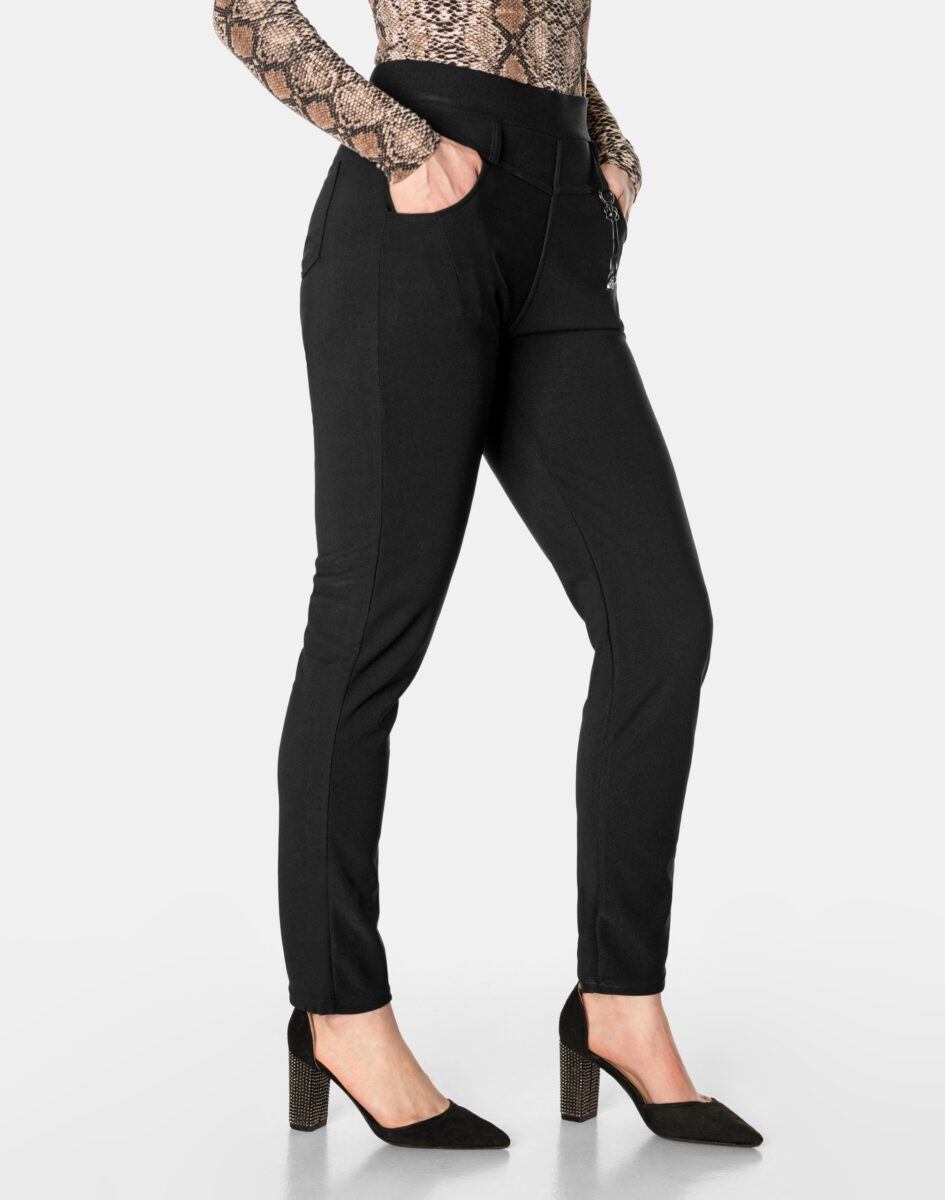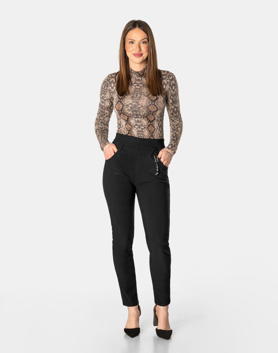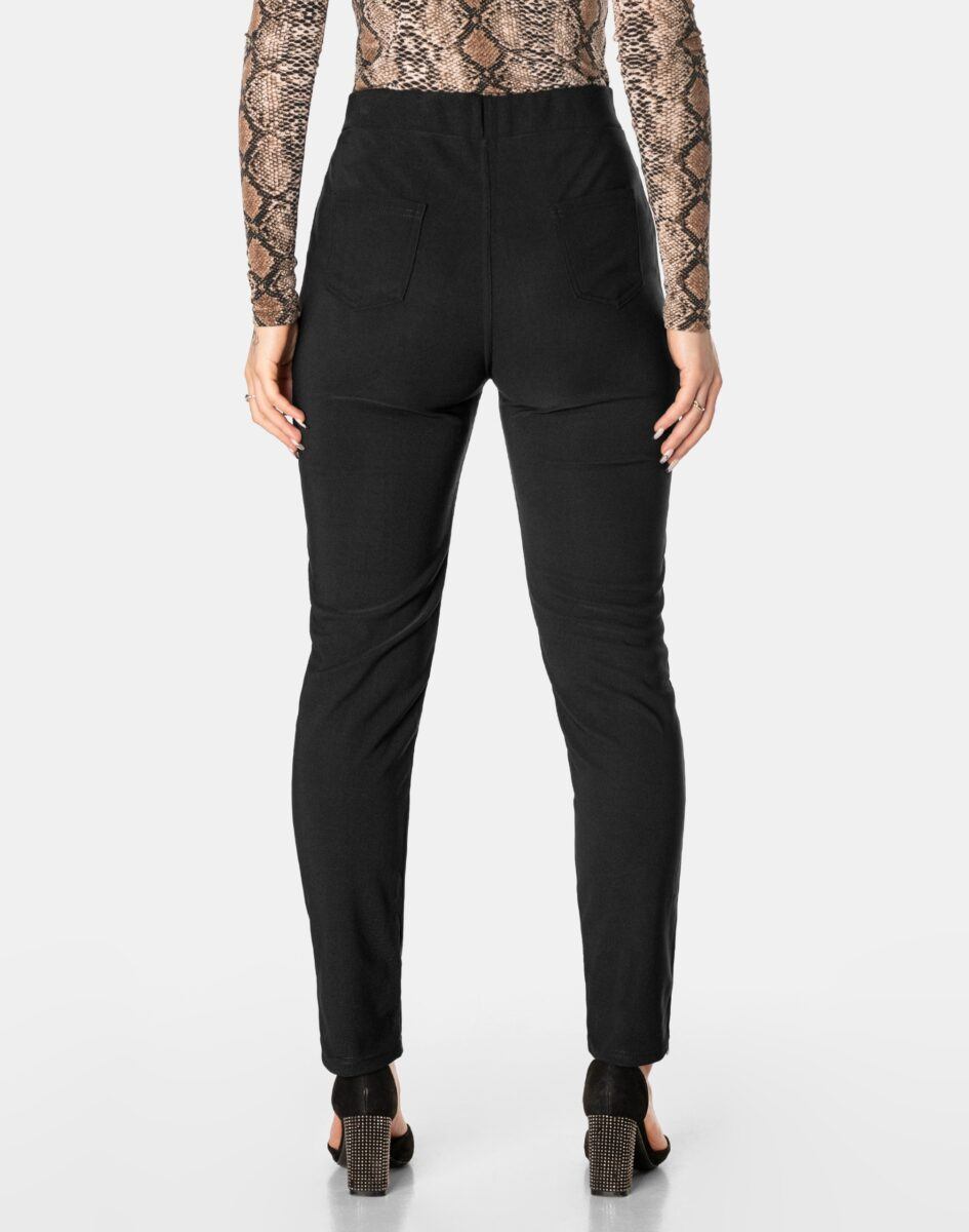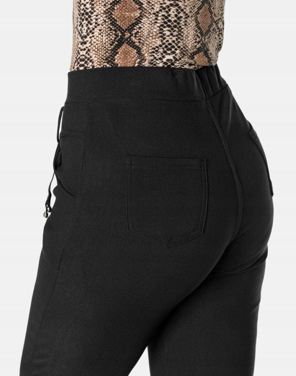 Wykonane z wysokiej jakości dzianiny bawełnianej średniej grubości z dodatkiem spandexu (lycra) dzięki czemu spodnie są bardziej elastyczne, bardzo dobrze się układają i dopasowują do każdej figury. Pozwalają na pełną swobodę ruchów co daje komfort przy siadaniu i zapewnia ogromny komfort noszenia. Trwałe i elastyczne wykończenie spodni (użycie do produkcji elastycznych nici) gwarantuje komfort i wygodę ich użytkownikowi w każdych warunkach, a tkanina jest na tyle gruba, że nie widać przez nią bielizny. Sprawdzony przez wiele zadowolonych klientek uniwersalny i modny krój typu cygaretki z lekko zwężoną nogawką i wyższym stanem, które założysz na wiele różnych okazji.