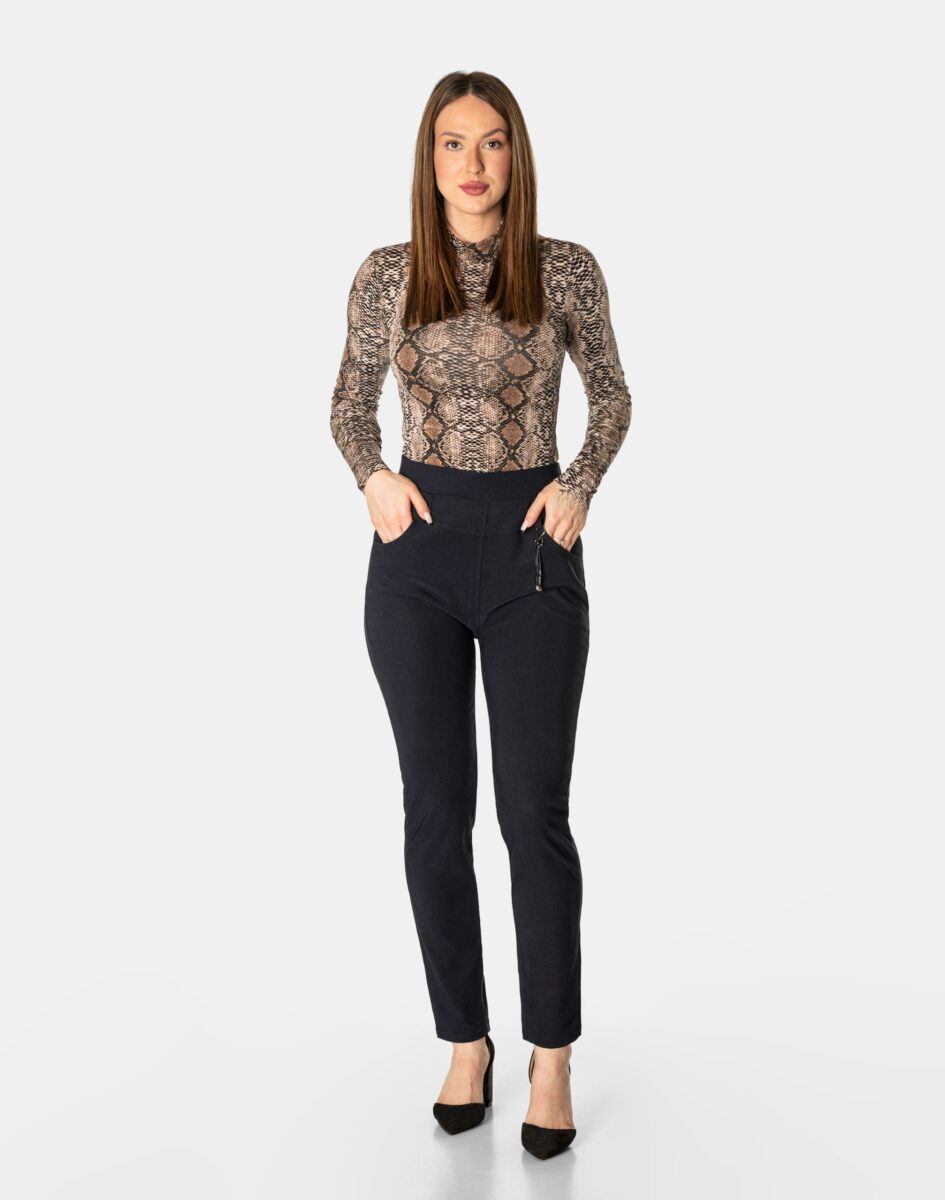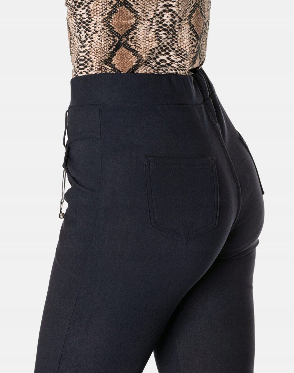 Wykonane z wysokiej jakości dzianiny bawełnianej średniej grubości z dodatkiem spandexu (lycra) dzięki czemu spodnie są bardziej elastyczne, bardzo dobrze się układają i dopasowują do każdej figury. Pozwalają na pełną swobodę ruchów co daje komfort przy siadaniu i zapewnia ogromny komfort noszenia. Trwałe i elastyczne wykończenie spodni (użycie do produkcji elastycznych nici) gwarantuje komfort i wygodę ich użytkownikowi w każdych warunkach, a tkanina jest na tyle gruba, że nie widać przez nią bielizny. Sprawdzony przez wiele zadowolonych klientek uniwersalny i modny krój typu cygaretki z lekko zwężoną nogawką i wyższym stanem, które założysz na wiele różnych okazji.