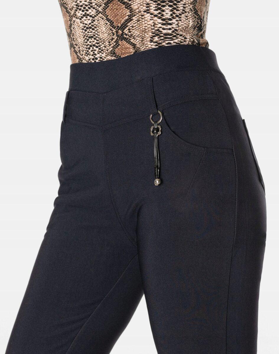 Wykonane z wysokiej jakości dzianiny bawełnianej średniej grubości z dodatkiem spandexu (lycra) dzięki czemu spodnie są bardziej elastyczne, bardzo dobrze się układają i dopasowują do każdej figury. Pozwalają na pełną swobodę ruchów co daje komfort przy siadaniu i zapewnia ogromny komfort noszenia. Trwałe i elastyczne wykończenie spodni (użycie do produkcji elastycznych nici) gwarantuje komfort i wygodę ich użytkownikowi w każdych warunkach, a tkanina jest na tyle gruba, że nie widać przez nią bielizny. Sprawdzony przez wiele zadowolonych klientek uniwersalny i modny krój typu cygaretki z lekko zwężoną nogawką i wyższym stanem, które założysz na wiele różnych okazji.
