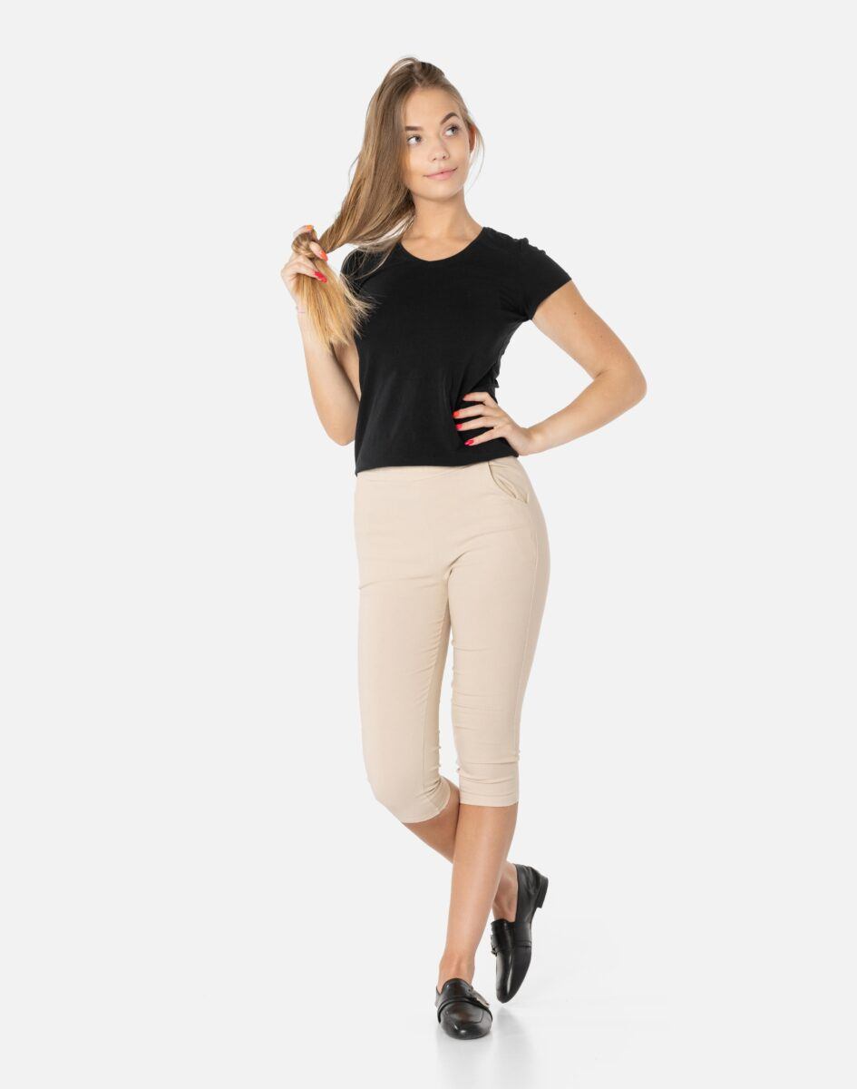 Klasyczne, spodnie rybaczki damskie o wyszczuplającym optycznie kobiecą sylwetkę fasonie i wyższym stanie. Na bokach mają dwie wpuszczane, skośne kieszenie na dłonie. Dopasowanie w pasie zapewnia szeroki, elastyczny pas wyszczuplający, który zgrabnie modeluje sylwetkę w talii. Nie mają żadnego zamka ani guzików, a przez tkaninę nie prześwituje bielizna. Uniwersalny, zawsze modny krój z dopasowaną nogawką i wyższym stanem, które założysz na wiele różnych okazji.
