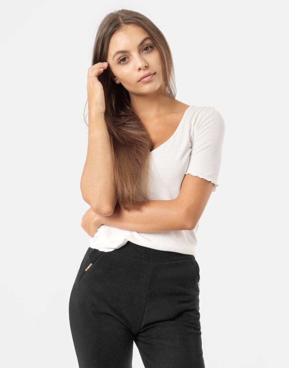 Ciepłe spodnie damskie bardzo szykowne cygaretki w stylu Glamour na jesień, zimę z podwyższonym stanem i ocieplone od wewnętrznej strony mikropolarem. Z przodu mają dwie kieszenie wpuszczane na dłonie z tyłu dwie kieszonki naszywane. Dopasowanie w pasie zapewnia szeroki elastyczny pas ściągający zgrabnie modelujący sylwetkę w talii. Jak w typowych cygaretkach nogawka zwężana kończąca się na wysokości kostki dzięki temu sylwetka wygląda w nich lekko i zgrabnie. Oferowane przez nas spodnie są unikalnym połączeniem tkaniny poliestrowej z dodatkiem wiskozy i elastanu, a od wewnątrz bardzo ciepłego i przyjemnego w kontakcie ze skórą mikropolaru. Dodatek elastanu sprawia że spodnie są bardziej elastyczne co pozwala na pełną swobodę ruchów, daje komfort przy siadaniu i zapewnia ogromny komfort noszenia. Warstwa wewnętrzna spodni wykonana z ciepłego mikropolaru ma za zadanie zapewnić oddychalność i maksymalną ochronę w zmiennych warunkach i niskiej temperaturze. Takie wykończenie wewnętrznej strony spodni zapewnia bardzo wysoki wskaźnik ochrony termicznej, jak również zdecydowanie podnosi komfort użytkowania tych spodni jesienią a zwłaszcza zimą. Spodnie są przez to bardzo ciepłe, wygodne i oddychające (utrzymują ciepły i suchy mikroklimat skóry), a jednocześnie wyjątkowo lekkie.