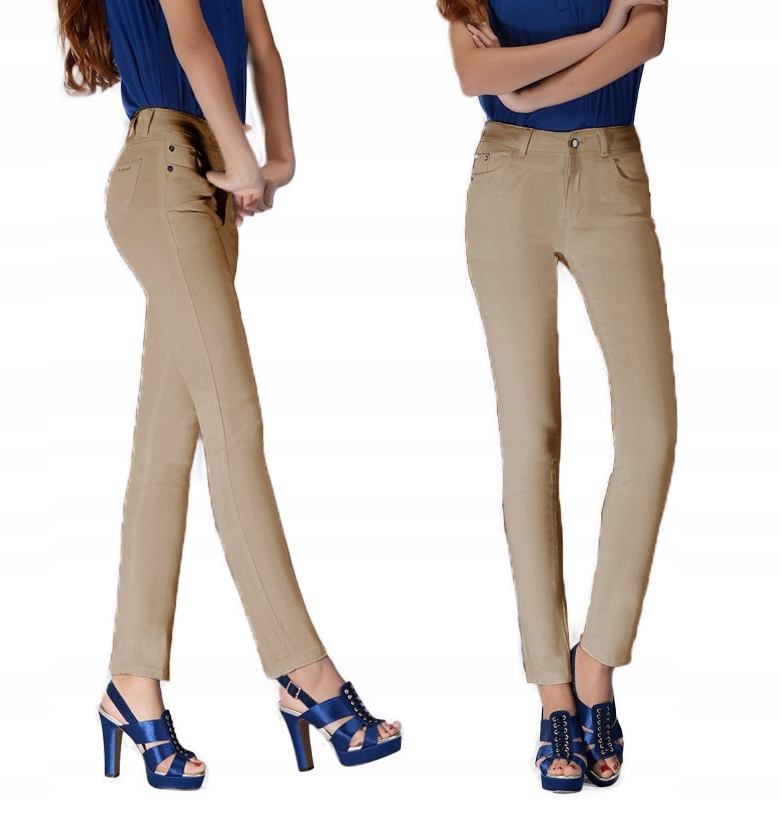 Eleganckie spodnie damskie bawełniane z wyższym stanem i wąską, dopasowaną nogawką to jeden z najczęściej wybieranych przez modne kobiety modeli spodni. Wykonane z wysokiej jakości cienkiej tkaniny bawełnianej o jednolitym wybarwieniu z dodatkiem lycry (elastan). Niewielki dodatek lycry sprawia że spodnie są bardziej elastyczne i doskonale dopasowują się do każdej sylwetki. Pozwalają na pełną swobodę ruchów co daje użytkownikowi wygodę przy siadaniu i zapewnia ogromny komfort noszenia. Zapinane są na kryty zamek błyskawiczny i metalowy guzik sygnowany logiem firmy. Z przodu mają dwie kieszonki zaokrąglone oraz mniejszą kieszonkę tzw. bilonówkę, a na tyle klasyczne kieszenie naszywane jak w typowych spodniach jeansowych. W pasie szlufki umożliwiające stylizacje z paskiem. Najbardziej podatne na uszkodzenia miejsca wzmocnione są dodatkowymi przeszyciami i ozdobnymi nitami.