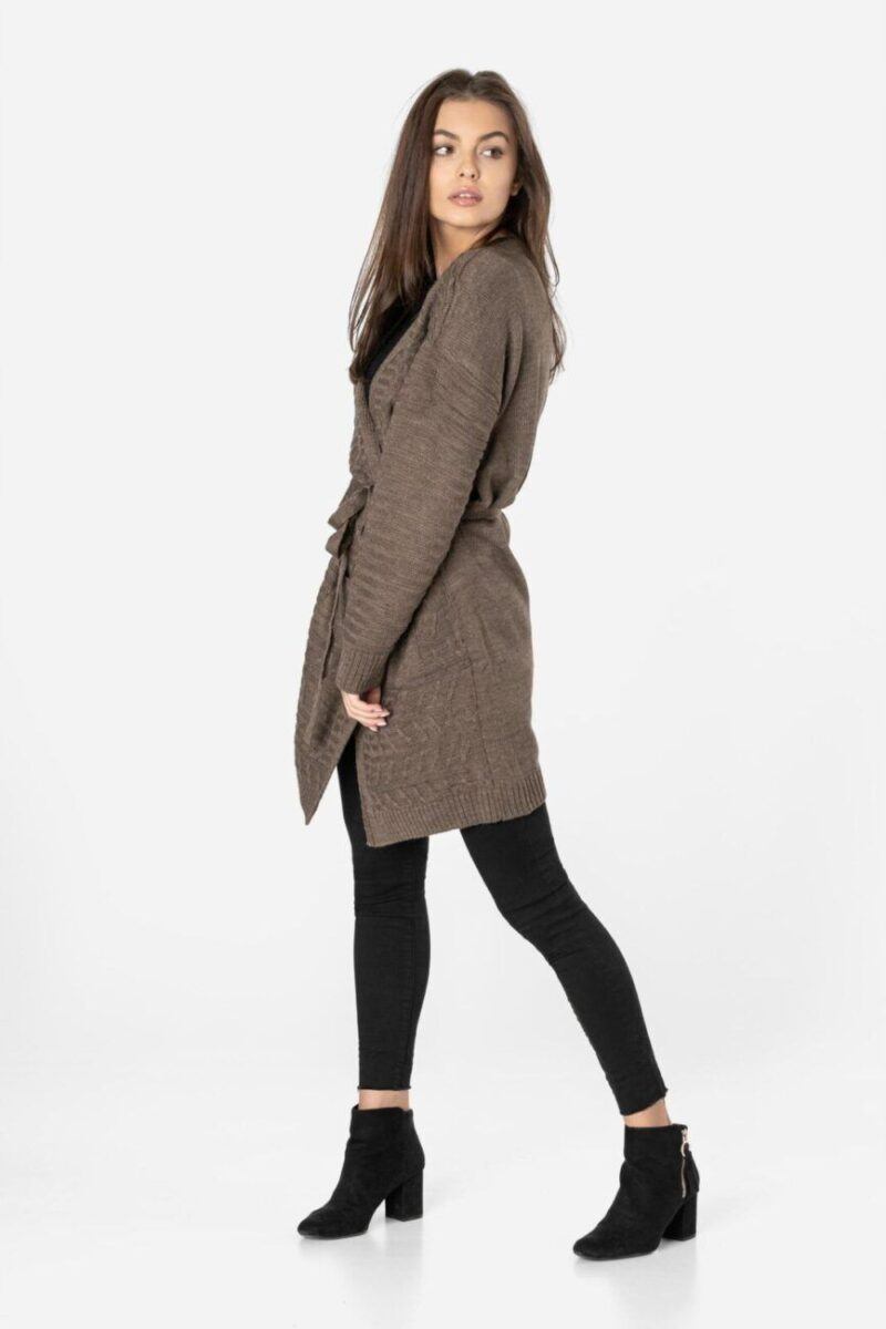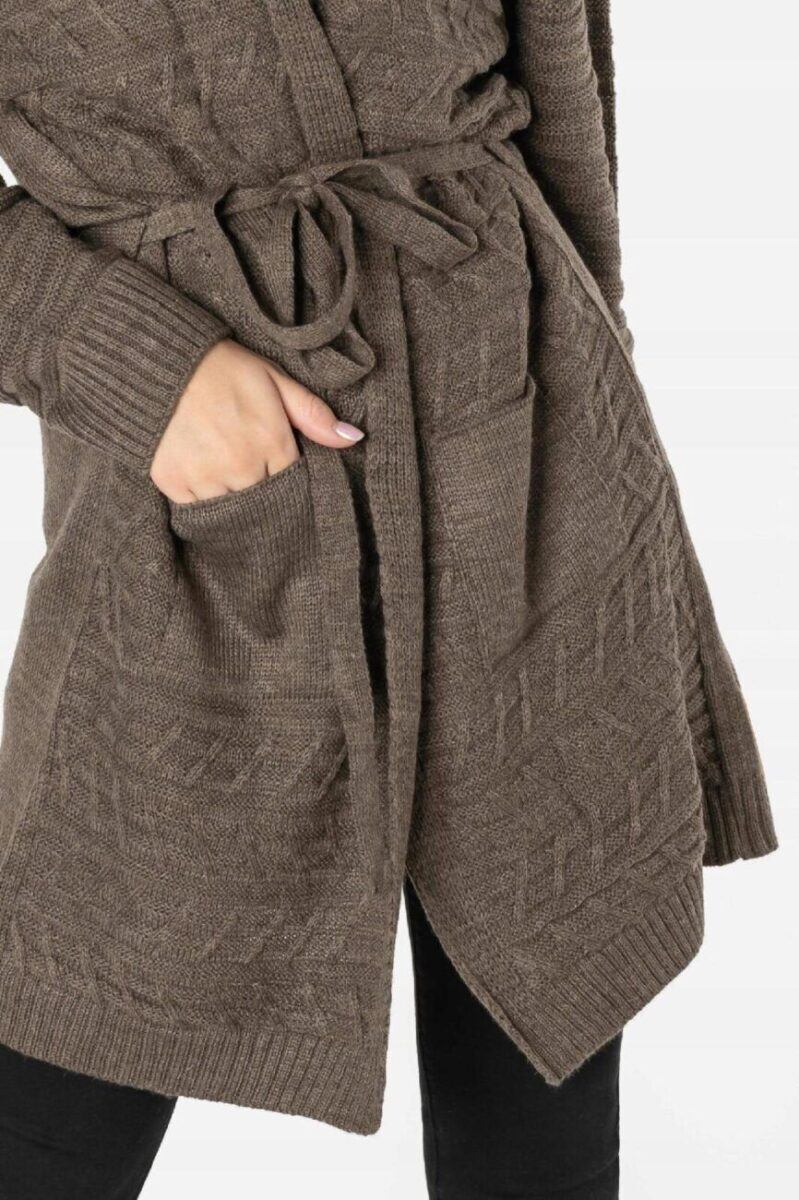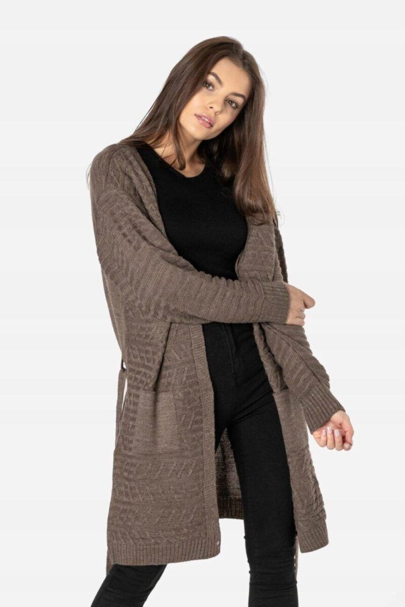 Długi damski wiązany kardigan wyprodukowany z miękkiej dzianiny akrylowej zapewniającej wysoki komfort noszenia to idealny wybór na chłodniejsze dni i wieczory. Wkładany jako narzutka z atrakcyjnie wydłużonym wyprofilowanym dekoltem dodającym mu troszkę sexapilu z powodzeniem zastępuje bardziej formalną marynarkę. Pogłębiony dekolt stwarza pole dla efektownego wyeksponowania biżuterii, kolorowej apaszki lub szala. Zgrabnie dopasowany choć luźny i zwiewny dla lepszego podkreślenia walorów sylwetki a przy tym bardzo zmysłowy od dawna stał się symbolem casualowej elegancji. To okrycie w bardzo swobodnym, sportowym stylu, pasuje zatem do jeansów, spodni z dzianiny a nawet dresów i będziesz wyglądać w nim bardzo kobieco jak i swobodnie. Kardigan to „sweter-kameleon” idealny na każdą okazję i do różnych stylizacji od tych casualowych do bardziej eleganckich. Stylowy i modny w każdym sezonie pasuje do każdej sylwetki i wieku. Idealny w przypadku kobiet poszukujących nieszablonowych i oryginalnych akcentów w swoim ubiorze.