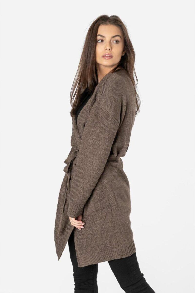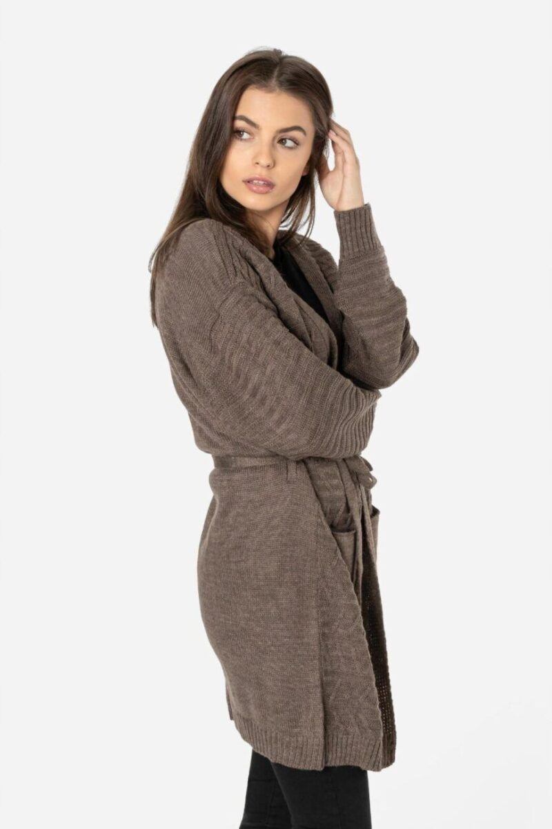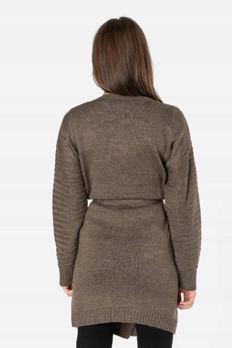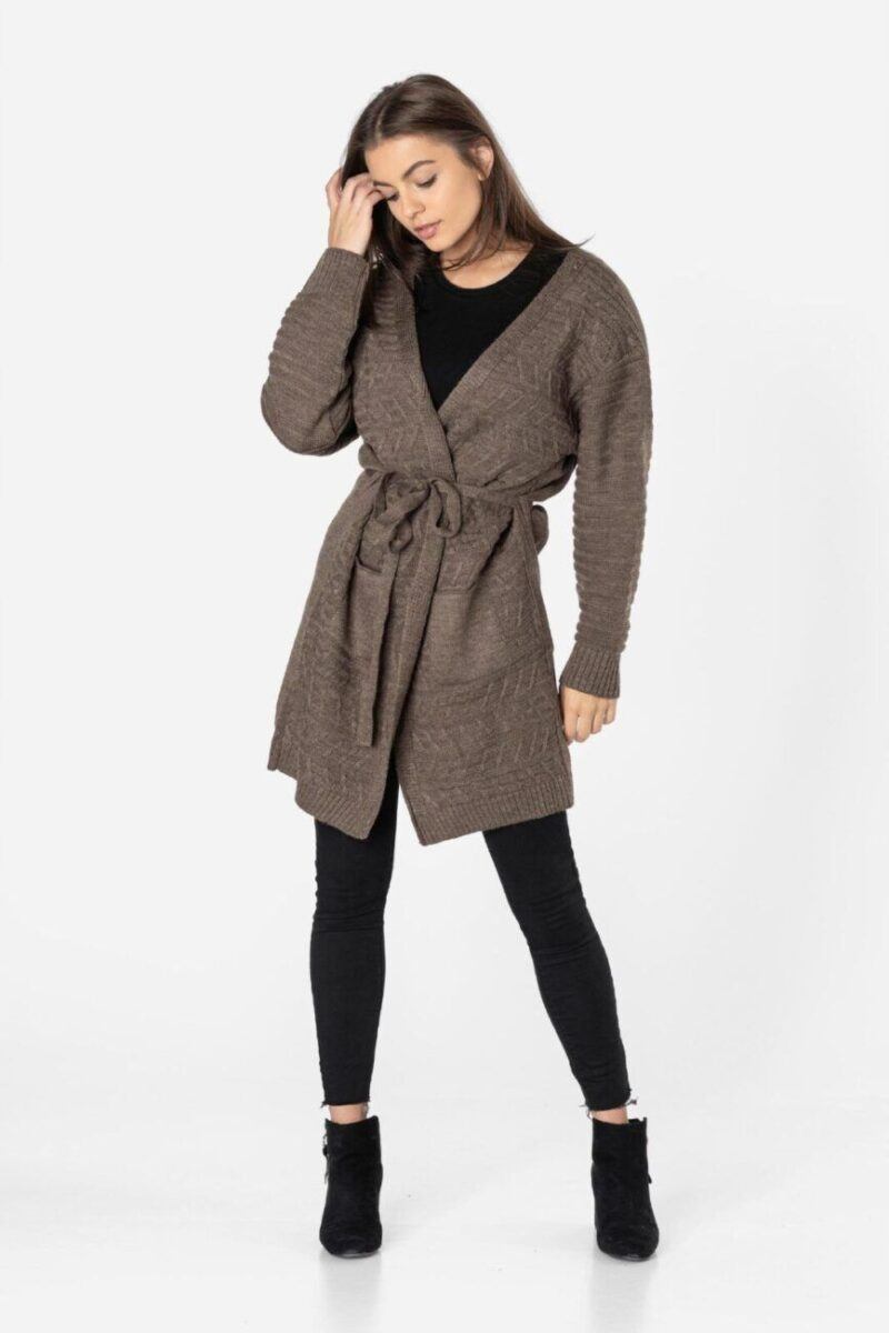 Długi damski wiązany kardigan wyprodukowany z miękkiej dzianiny akrylowej zapewniającej wysoki komfort noszenia to idealny wybór na chłodniejsze dni i wieczory. Wkładany jako narzutka z atrakcyjnie wydłużonym wyprofilowanym dekoltem dodającym mu troszkę sexapilu z powodzeniem zastępuje bardziej formalną marynarkę. Pogłębiony dekolt stwarza pole dla efektownego wyeksponowania biżuterii, kolorowej apaszki lub szala. Zgrabnie dopasowany choć luźny i zwiewny dla lepszego podkreślenia walorów sylwetki a przy tym bardzo zmysłowy od dawna stał się symbolem casualowej elegancji. To okrycie w bardzo swobodnym, sportowym stylu, pasuje zatem do jeansów, spodni z dzianiny a nawet dresów i będziesz wyglądać w nim bardzo kobieco jak i swobodnie. Kardigan to „sweter-kameleon” idealny na każdą okazję i do różnych stylizacji od tych casualowych do bardziej eleganckich. Stylowy i modny w każdym sezonie pasuje do każdej sylwetki i wieku. Idealny w przypadku kobiet poszukujących nieszablonowych i oryginalnych akcentów w swoim ubiorze.