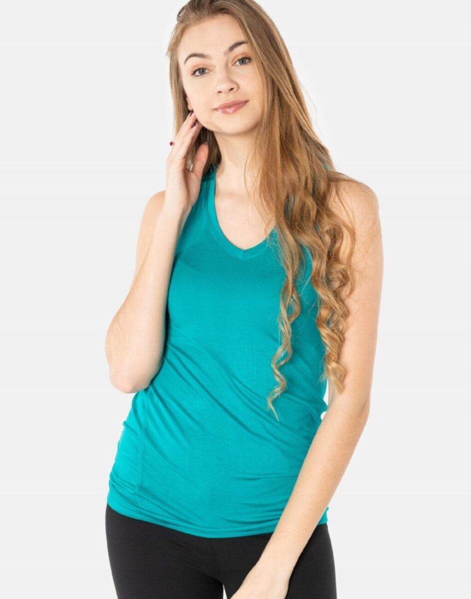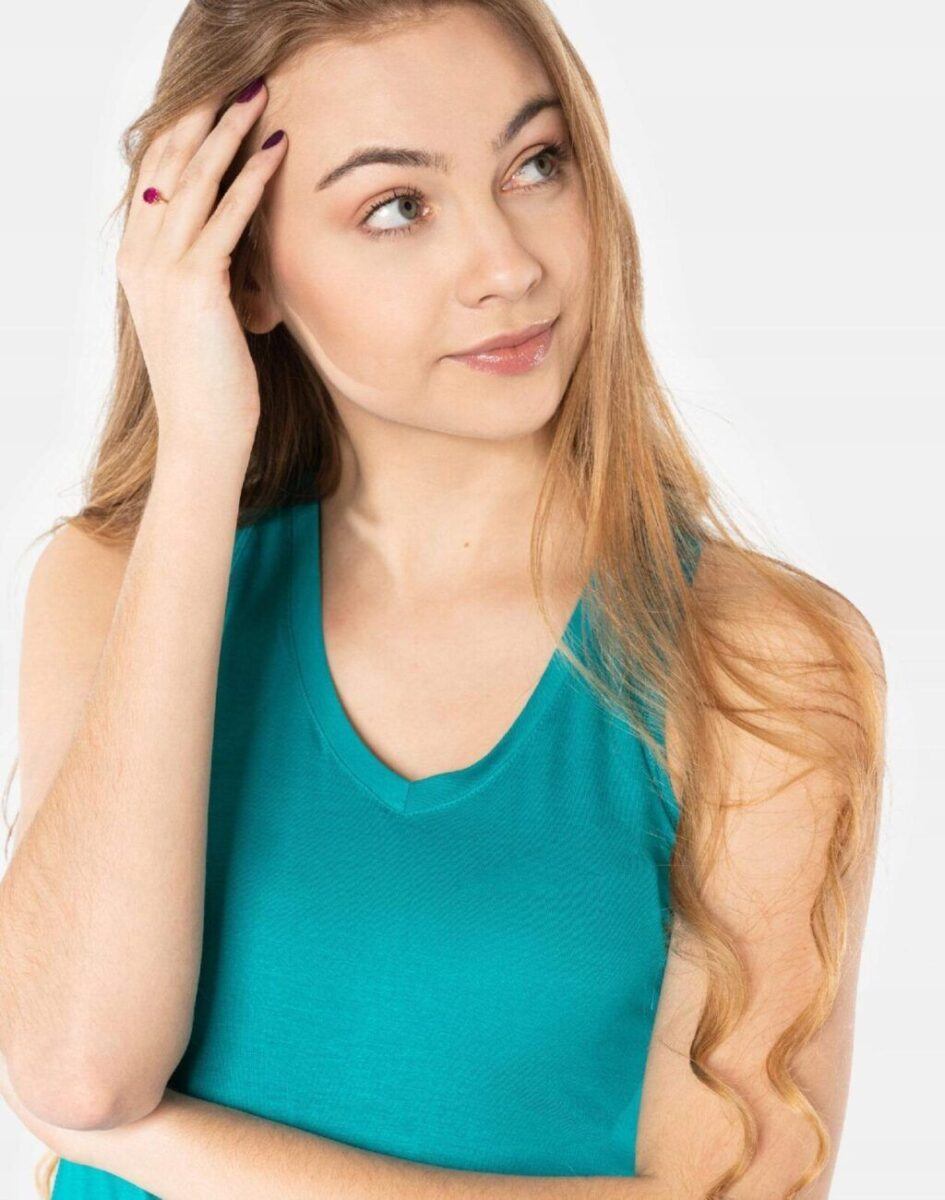 Lekka jak piórko o delikatnie taliowanym kroju, cienka i przewiewna, idealna na co dzień jako element casualowego stroju czyniąc go lekkim i dostosowanym do wysokich temperatur. Wykonana z wysokiej jakości dzianiny wiskozowej z domieszką elastanu, który cechuje przede wszystkim lekkość i zwiewność. Zastosowany materiał jest oddychający, odporny na promieniowanie UV, elastyczny, rozciągliwy w czterech kierunkach, idealnie dopasowuje się i jest bardzo komfortowy. Przyjemny w dotyku i odporny na zmechacenie a dzięki silikonowaniu włókien w procesie produkcji idealnie gładki. Zdobył aprobatę tysięcy zadowolonych klientek i uznawany jest za jeden z najlepszych do produkcji sportowej odzieży damskiej.
