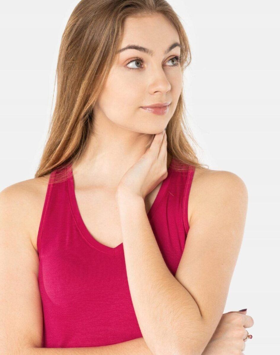 Lekka jak piórko o delikatnie taliowanym kroju, cienka i przewiewna, idealna na co dzień jako element casualowego stroju czyniąc go lekkim i dostosowanym do wysokich temperatur. Wykonana z wysokiej jakości dzianiny wiskozowej z domieszką elastanu, który cechuje przede wszystkim lekkość i zwiewność. Zastosowany materiał jest oddychający, odporny na promieniowanie UV, elastyczny, rozciągliwy w czterech kierunkach, idealnie dopasowuje się i jest bardzo komfortowy. Przyjemny w dotyku i odporny na zmechacenie a dzięki silikonowaniu włókien w procesie produkcji idealnie gładki. Zdobył aprobatę tysięcy zadowolonych klientek i uznawany jest za jeden z najlepszych do produkcji sportowej odzieży damskiej.
