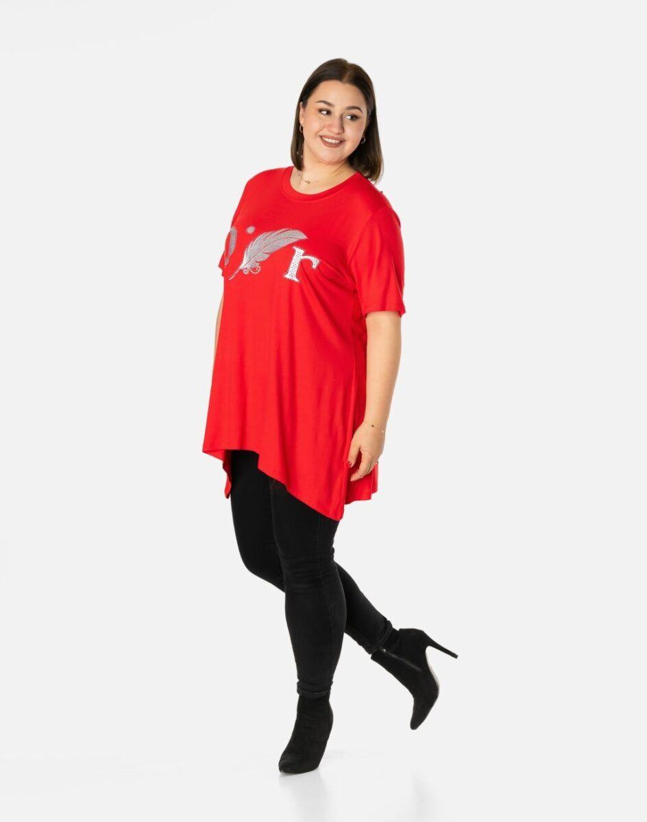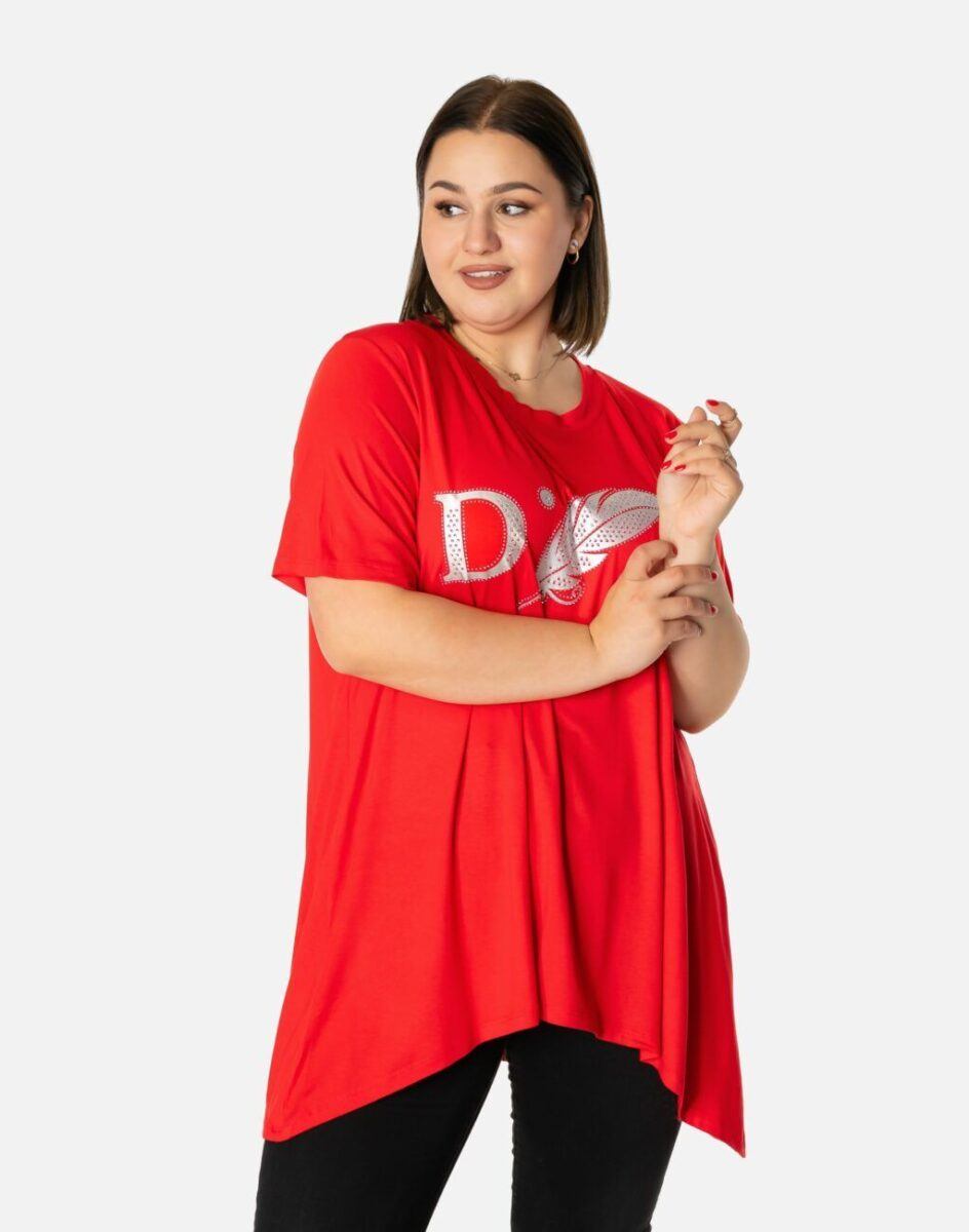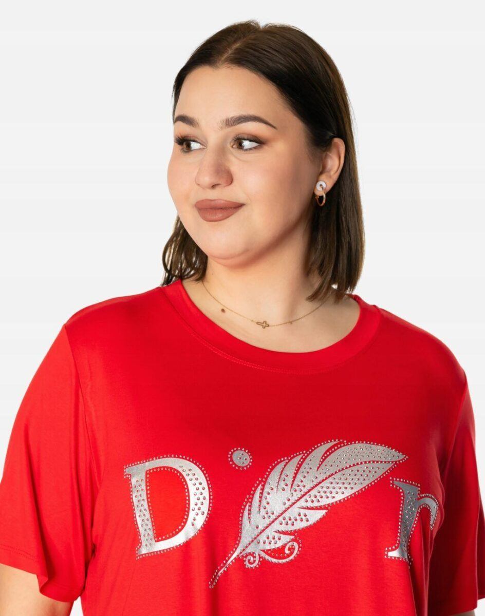 … luźna, wygodna z krótkim rękawem i efektownym nadrukiem z ozdobnymi cyrkoniami to idealne połączenie kobiecości i komfortu, które doskonale sprawdzi się podczas codziennego użytkowania.