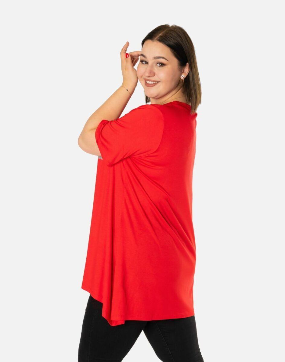 Efektowna tunika/bluzka damska wyprodukowana z wysokiej jakości elastycznej, miłej w dotyku i przyjemnej dla ciała cienkiej dzianiny (jedwab syntetyczny) zapewniającej maksymalną wygodę i komfort użytkowania. Rayon określany mianem sztucznego jedwabiu, jest bardzo przyjemny w dotyku, lekko chłodzący (jak przystało na satynę), a zarazem niezwykle delikatny i posiada szlachetne, satynowe wykończenie. Można go nosić nawet w upalne dni, gdyż doskonale odprowadza wilgoć ze skóry, przez co na ubraniu nie pojawiają się mokre plamy o przykrym zapachu potu. Sztuczny jedwab (Rayon) sprawdzi się nawet w przypadku osób obdarzonych wysoką wrażliwością sensoryczną, które często skarżą się na drapiące materiały. Jego wyjątkowo gładka i delikatna struktura nie wywołuje żadnego dyskomfortu.