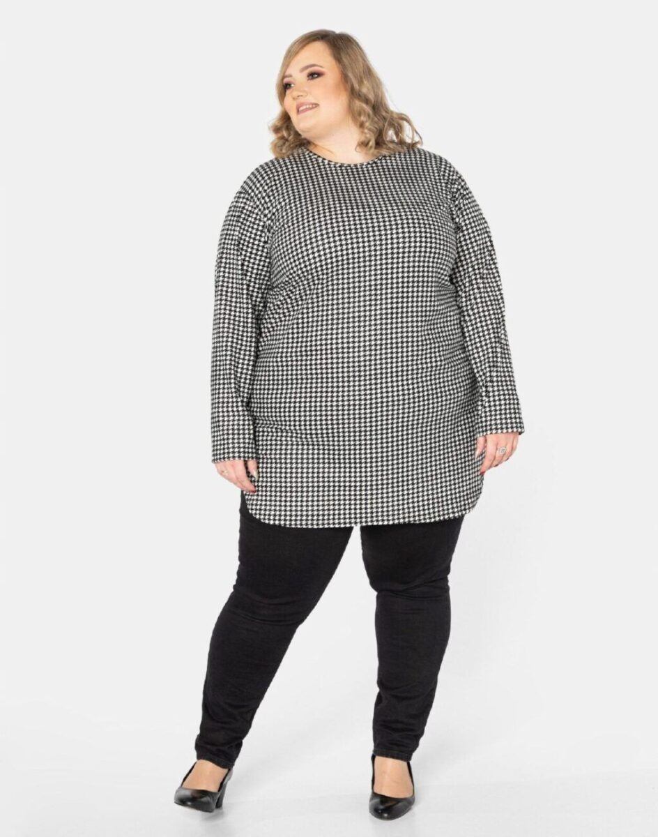 Efektowna tunika/sukienka damska wyprodukowana z wysokiej jakości, elastycznej dzianiny zapewniającej maksymalną wygodę i komfort użytkowania. Tunika to idealny wybór dla każdej kobiety, bo niezależnie od typu figury, wieku, czy rozmiaru jaki nosisz zawsze będziesz w niej wyglądać elegancko, kobieco i atrakcyjnie. Tunika została wykończona bardzo eleganckim wzorem w pepitkę. Możesz ją nosić na wiele różnych sposobów: jako sukienkę do rajstop bądź tunikę do spodni czy legginsów. Idealna na „szaloną imprezę” jak również do codziennego użytku. Możliwości jej wykorzystania są praktycznie nie ograniczone. Świetnie sprawdzi się w wielu różnych stylizacjach, które zależeć będą tylko i wyłącznie od Twojej wyobraźni.