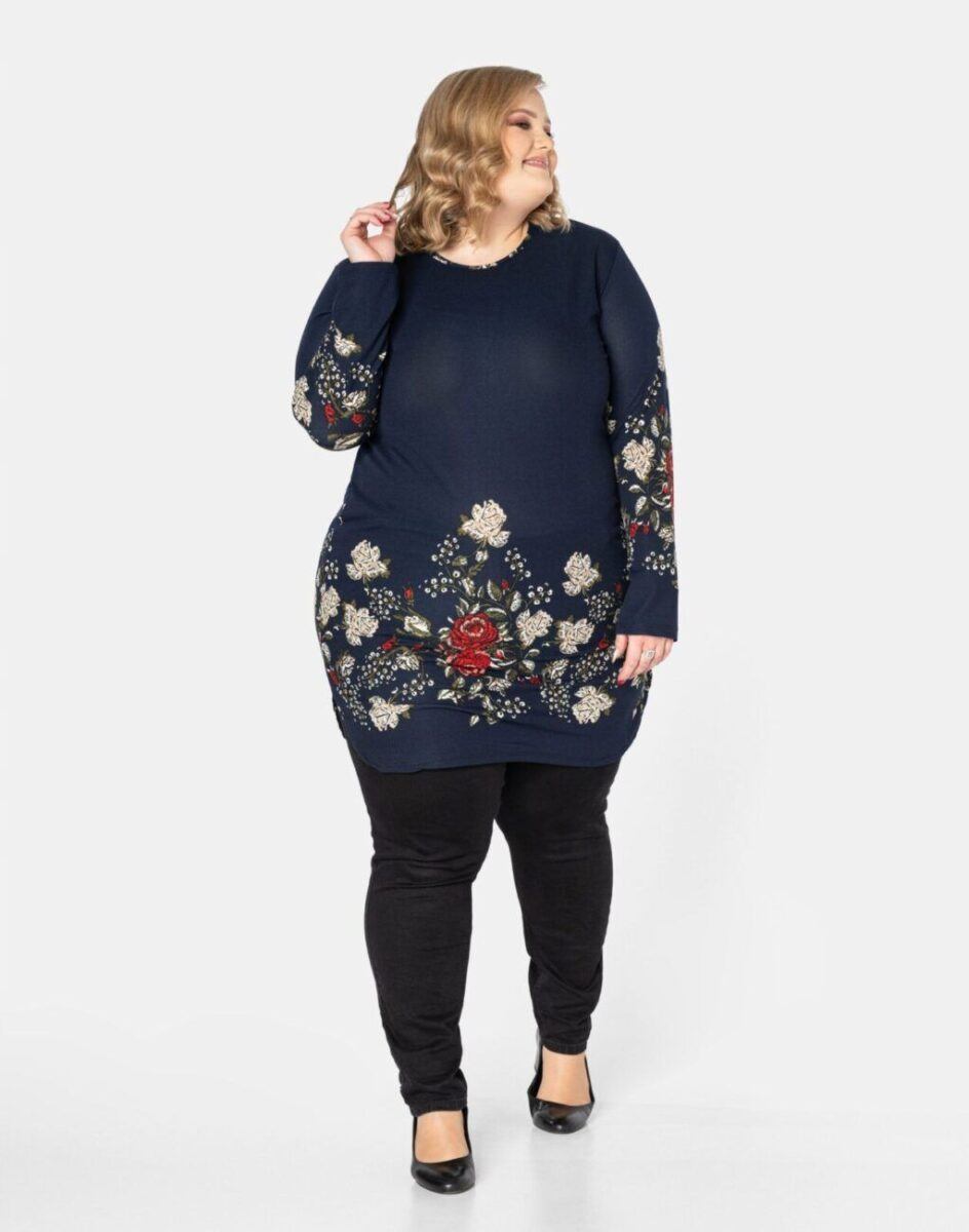 Efektowna tunika/sukienka damska wyprodukowana z wysokiej jakości, elastycznej dzianiny zapewniającej maksymalną wygodę i komfort użytkowania. Tunika to idealny wybór dla każdej kobiety, bo niezależnie od typu figury, wieku, czy rozmiaru jaki nosisz zawsze będziesz w niej wyglądać elegancko, kobieco i atrakcyjnie. Tunika została wykończona bardzo eleganckim motywem kwiatowym. Możesz ją nosić na wiele różnych sposobów: jako sukienkę do rajstop bądź tunikę do spodni czy legginsów. Idealna na „szaloną imprezę” jak również do codziennego użytku. Możliwości jej wykorzystania są praktycznie nie ograniczone. Świetnie sprawdzi się w wielu różnych stylizacjach, które zależeć będą tylko i wyłącznie od Twojej wyobraźni.