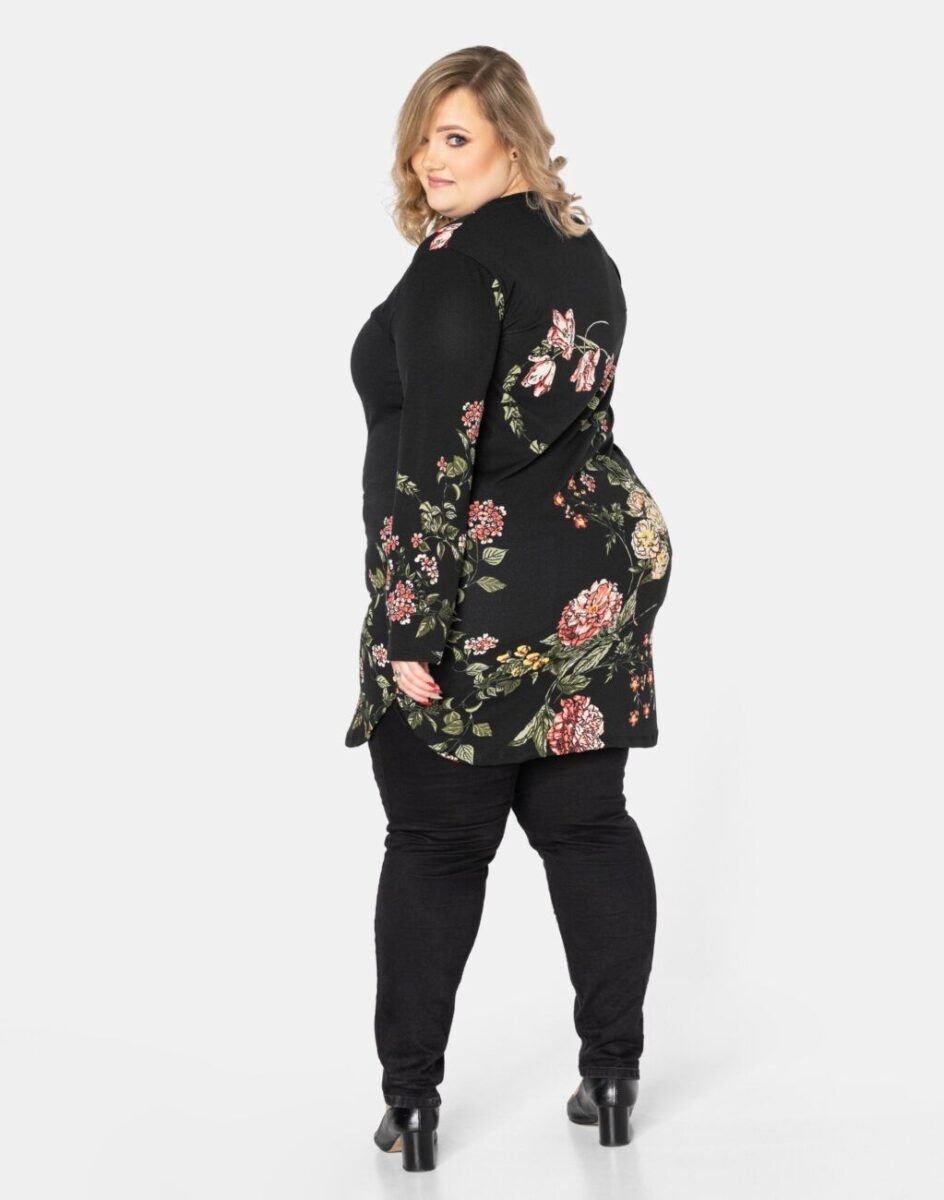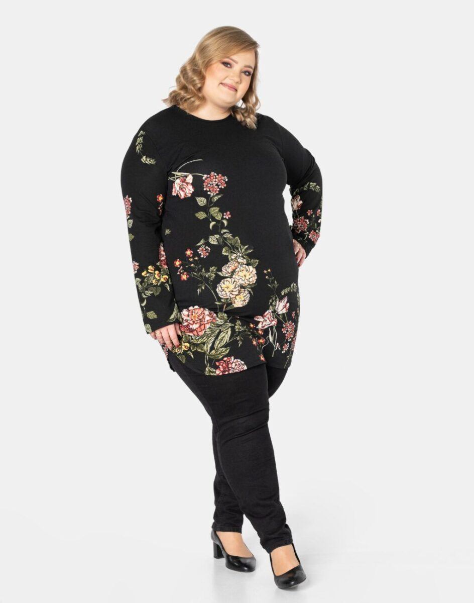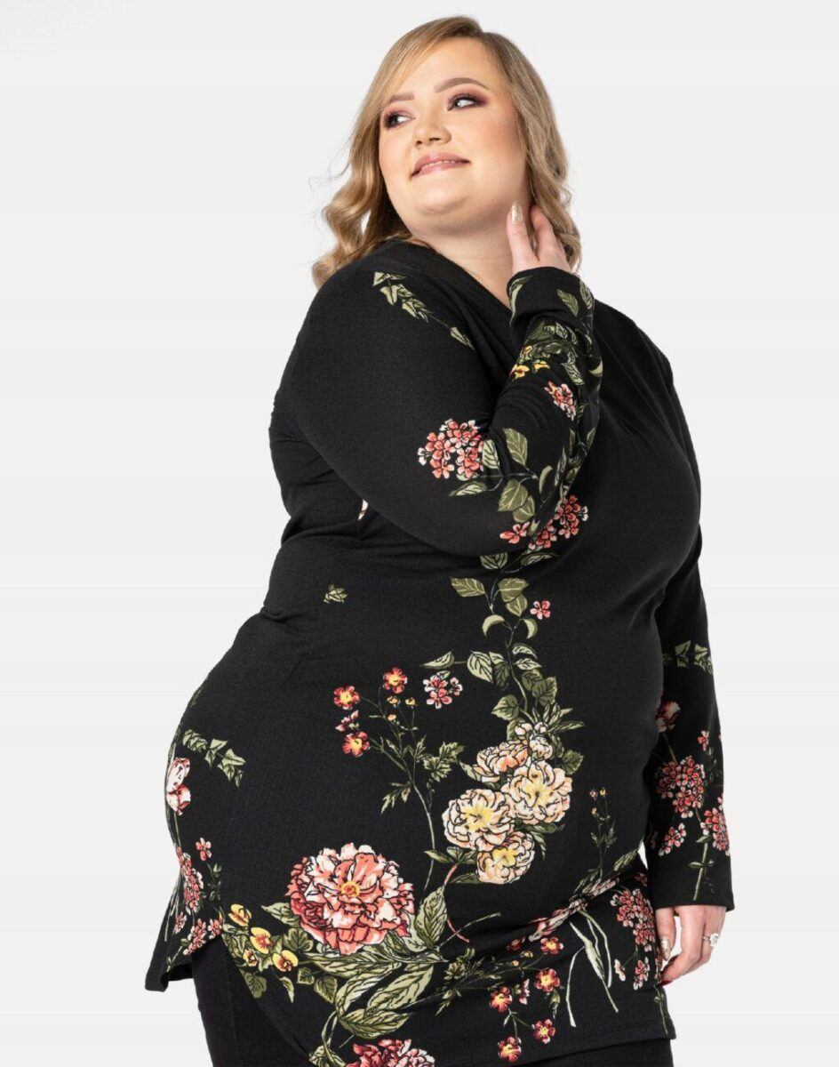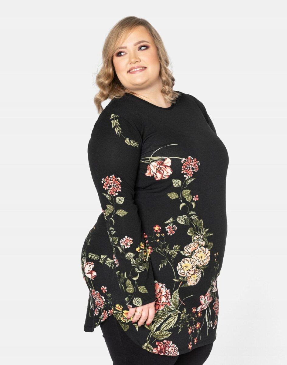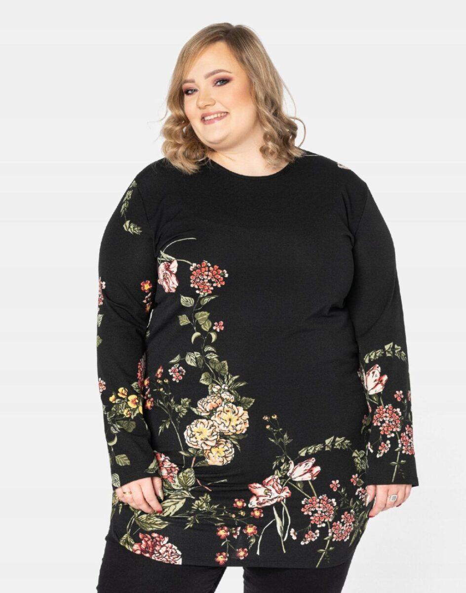 Efektowna tunika/sukienka damska wyprodukowana z wysokiej jakości, elastycznej dzianiny zapewniającej maksymalną wygodę i komfort użytkowania. Tunika to idealny wybór dla każdej kobiety, bo niezależnie od typu figury, wieku, czy rozmiaru jaki nosisz zawsze będziesz w niej wyglądać elegancko, kobieco i atrakcyjnie. Tunika została wykończona bardzo eleganckim motywem kwiatowym. Możesz ją nosić na wiele różnych sposobów: jako sukienkę do rajstop bądź tunikę do spodni czy legginsów. Idealna na „szaloną imprezę” jak również do codziennego użytku. Możliwości jej wykorzystania są praktycznie nie ograniczone. Świetnie sprawdzi się w wielu różnych stylizacjach, które zależeć będą tylko i wyłącznie od Twojej wyobraźni.