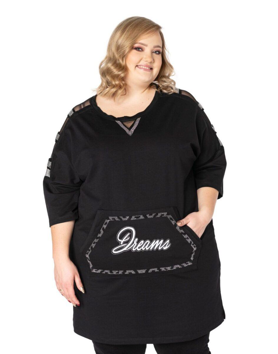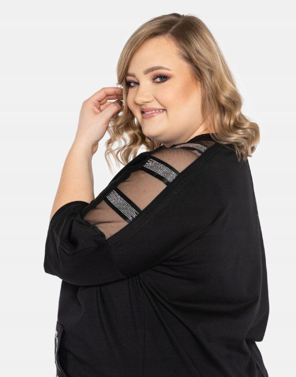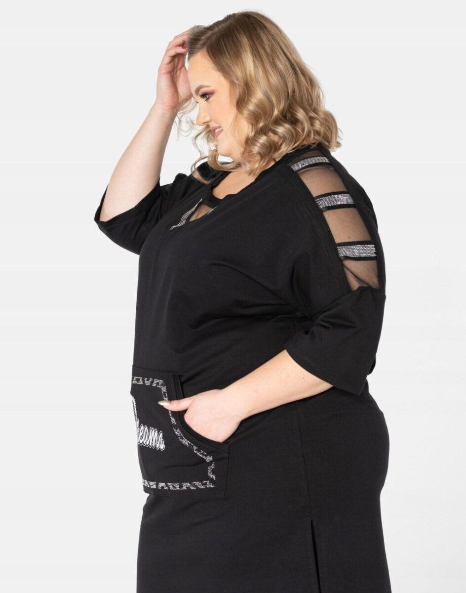 Efektowna tunika/sukienka damska wyprodukowana z wysokiej jakości, elastycznej dzianiny bawełnianej zapewniającej maksymalną wygodę i komfort użytkowania. Tunika to idealny wybór dla każdej kobiety, bo niezależnie od typu figury, wieku, czy rozmiaru jaki nosisz zawsze będziesz w niej wyglądać elegancko, kobieco i atrakcyjnie. Z przodu tunika posiada obszerną, pojedynczą kieszeń typu kangurka, wykończoną efektowną aplikacją, wyłożoną ozdobnymi cyrkoniami. Rękawy 3/4 posiadają transparentne wstawki na ramionach. Możesz ją nosić na wiele różnych sposobów: jako sukienkę do rajstop bądź tunikę do spodni czy legginsów. Idealna na „szaloną imprezę” jak również do codziennego użytku. Możliwości jej wykorzystania są praktycznie nie ograniczone. Świetnie sprawdzi się w wielu różnych stylizacjach które zależeć będą tylko i wyłącznie od Twojej wyobraźni.