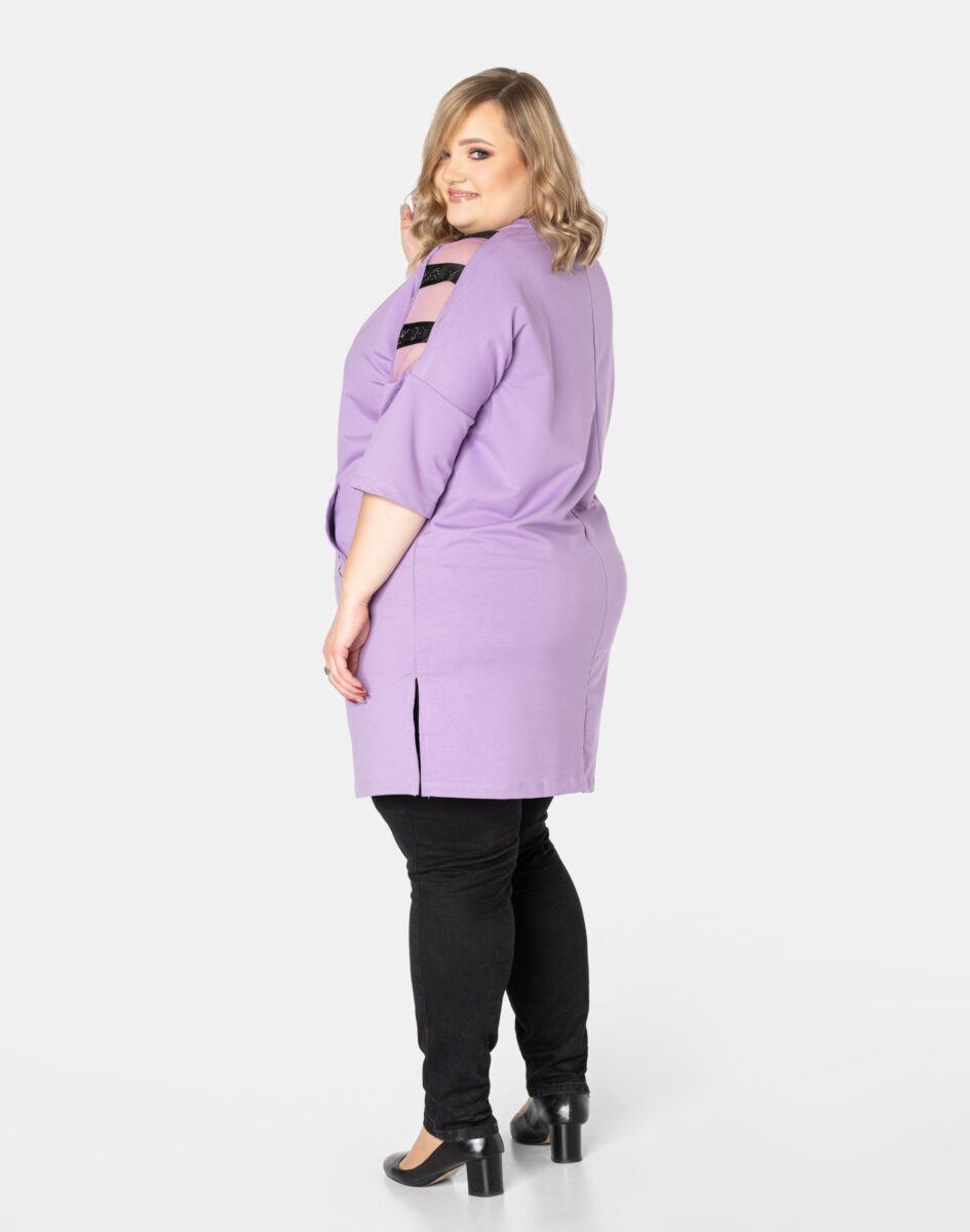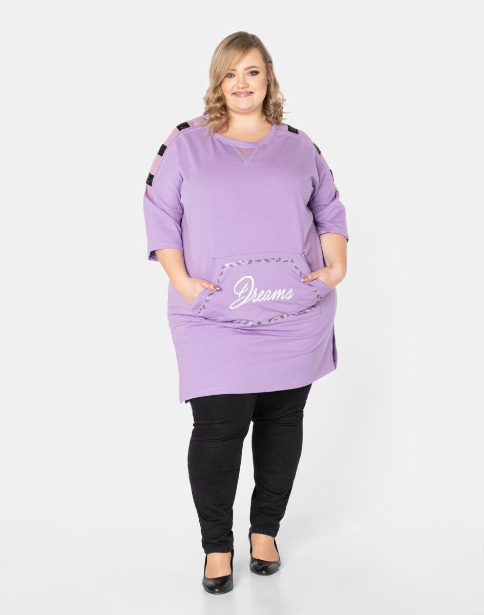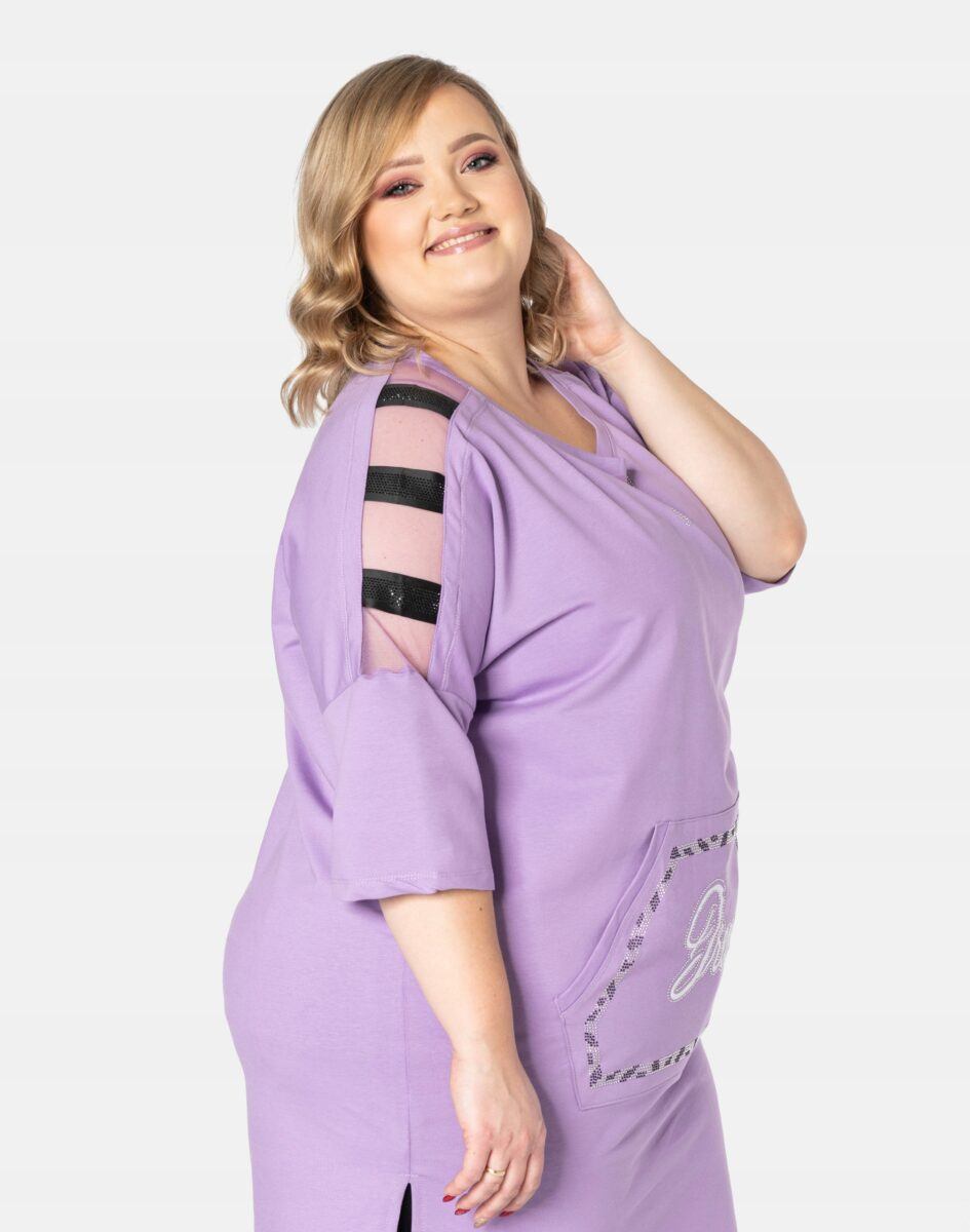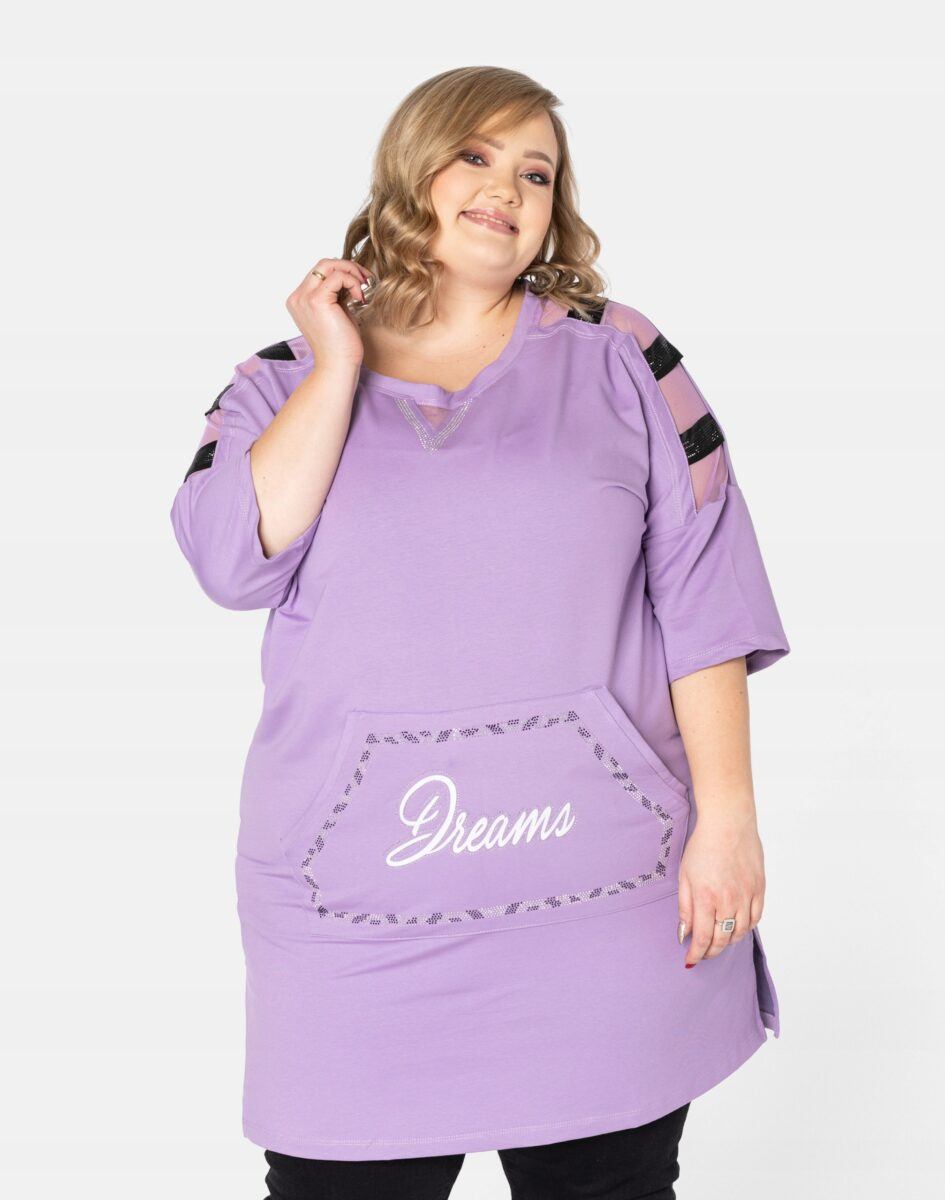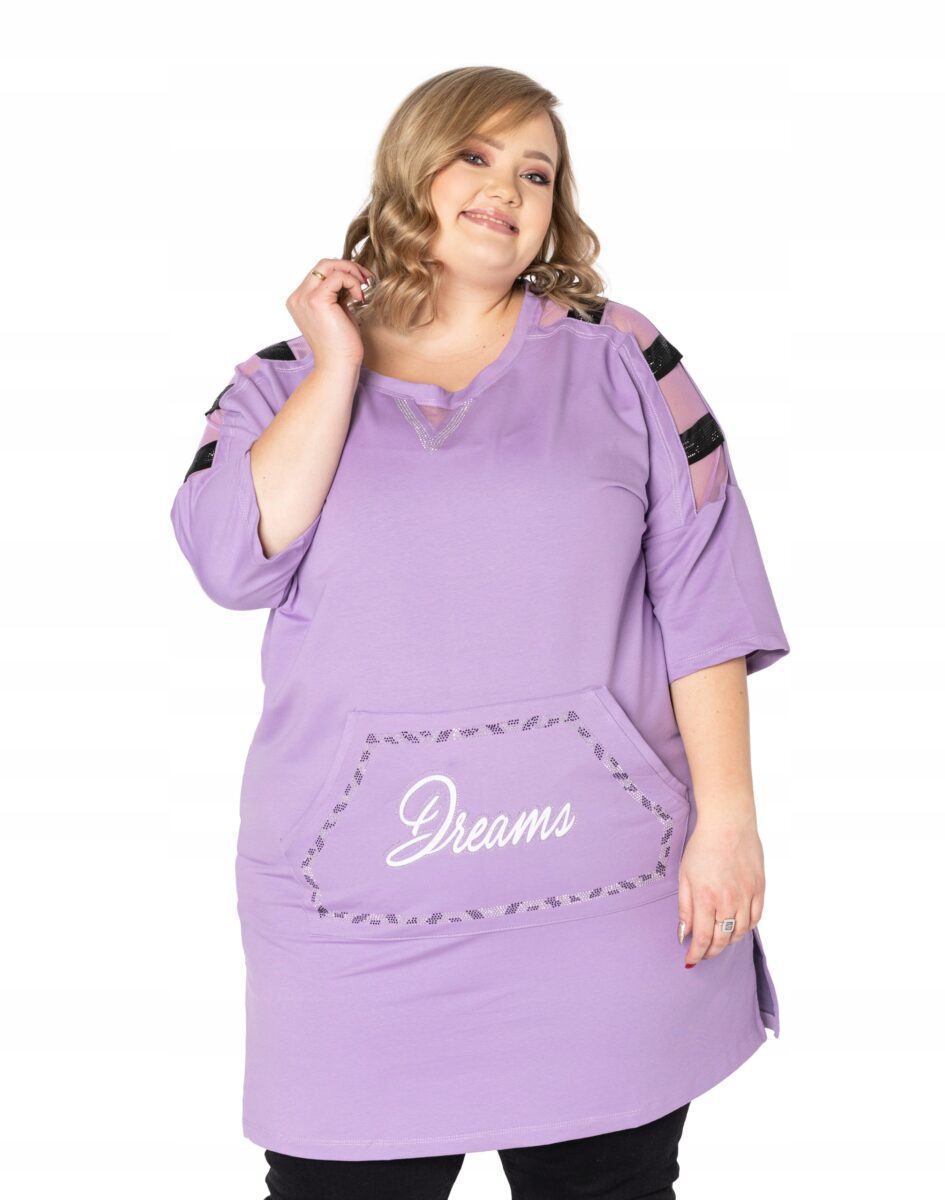 Efektowna tunika/sukienka damska wyprodukowana z wysokiej jakości, elastycznej dzianiny bawełnianej zapewniającej maksymalną wygodę i komfort użytkowania. Tunika to idealny wybór dla każdej kobiety, bo niezależnie od typu figury, wieku, czy rozmiaru jaki nosisz zawsze będziesz w niej wyglądać elegancko, kobieco i atrakcyjnie. Z przodu tunika posiada obszerną, pojedynczą kieszeń typu kangurka, wykończoną efektowną aplikacją, wyłożoną ozdobnymi cyrkoniami. Rękawy 3/4 posiadają transparentne wstawki na ramionach. Możesz ją nosić na wiele różnych sposobów: jako sukienkę do rajstop bądź tunikę do spodni czy legginsów. Idealna na „szaloną imprezę” jak również do codziennego użytku. Możliwości jej wykorzystania są praktycznie nie ograniczone. Świetnie sprawdzi się w wielu różnych stylizacjach które zależeć będą tylko i wyłącznie od Twojej wyobraźni.