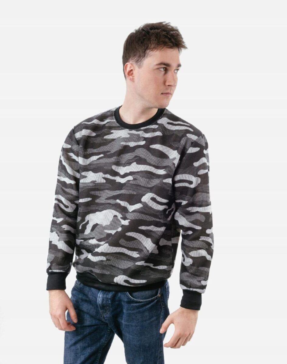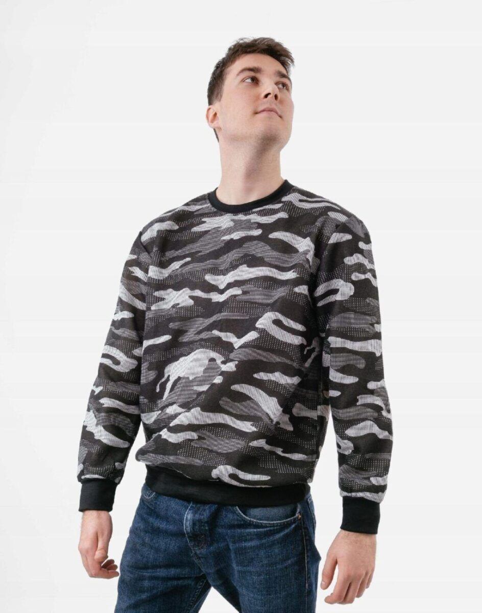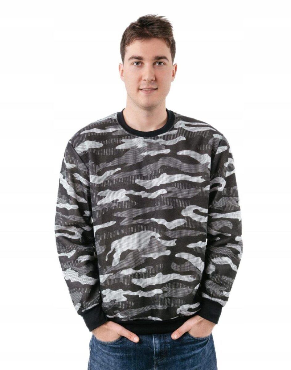 Bluza uszyta jest z wysokiej jakości naturalnej dzianiny bawełnianej średniej grubości z dodatkiem poliestru. Naturalna bawełna gwarantuje wspaniałą izolację cieplną, wchłanianie potu i oddychanie skóry a dodatek poliestru to gwarancja pełnej swobody ruchów oraz stabilności rozmiarów po wielokrotnym praniu. Dół bluzy oraz rękawy wykończone szerokim elastycznym ściągaczem. Wewnętrzna strona posiada wykończenie typu „MESCH” (fabrycznie wykończona jest miłym w dotyku i przyjemnym dla ciała meszkiem tzw. „szczotkowana”) zapewniające bardzo przyjemny kontakt ze skórą oraz komfort cieplny, natomiast zewnętrzna powierzchnia bluzy jest gładka i ozdobiona w deseń inspirowany wojskowym wzorem moro Camo który znają wszyscy na świecie. Ten charakterystyczny wzór jest uwielbiany przez fanów i fanki militarnego stylu ubierania. Możesz w niej chodzić na co dzień, idealnie nadaje się również do uprawiania różnych dyscyplin sportu i rekreacji. Ergonomiczny krój bluzy nie ogranicza swobody ruchów a właściwe dla odzieży sportowej proporcje surowcowe wpływają pozytywnie na komfort użytkowania. Sportowa bluza bawełniana przyda Ci się przez cały rok: w zimie możesz nosić ją pod kurtką, a wiosną, jesienią i latem przyda się jako samodzielne okrycie w chłodniejsze lub wietrzne dni.