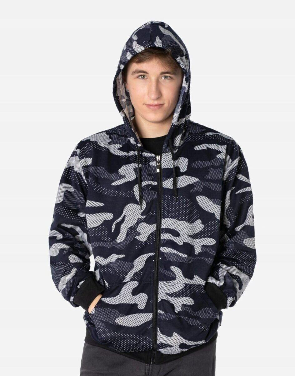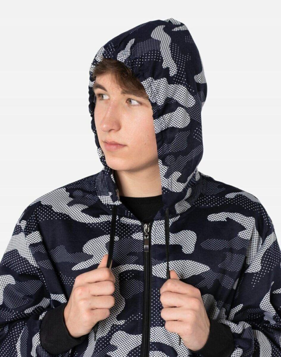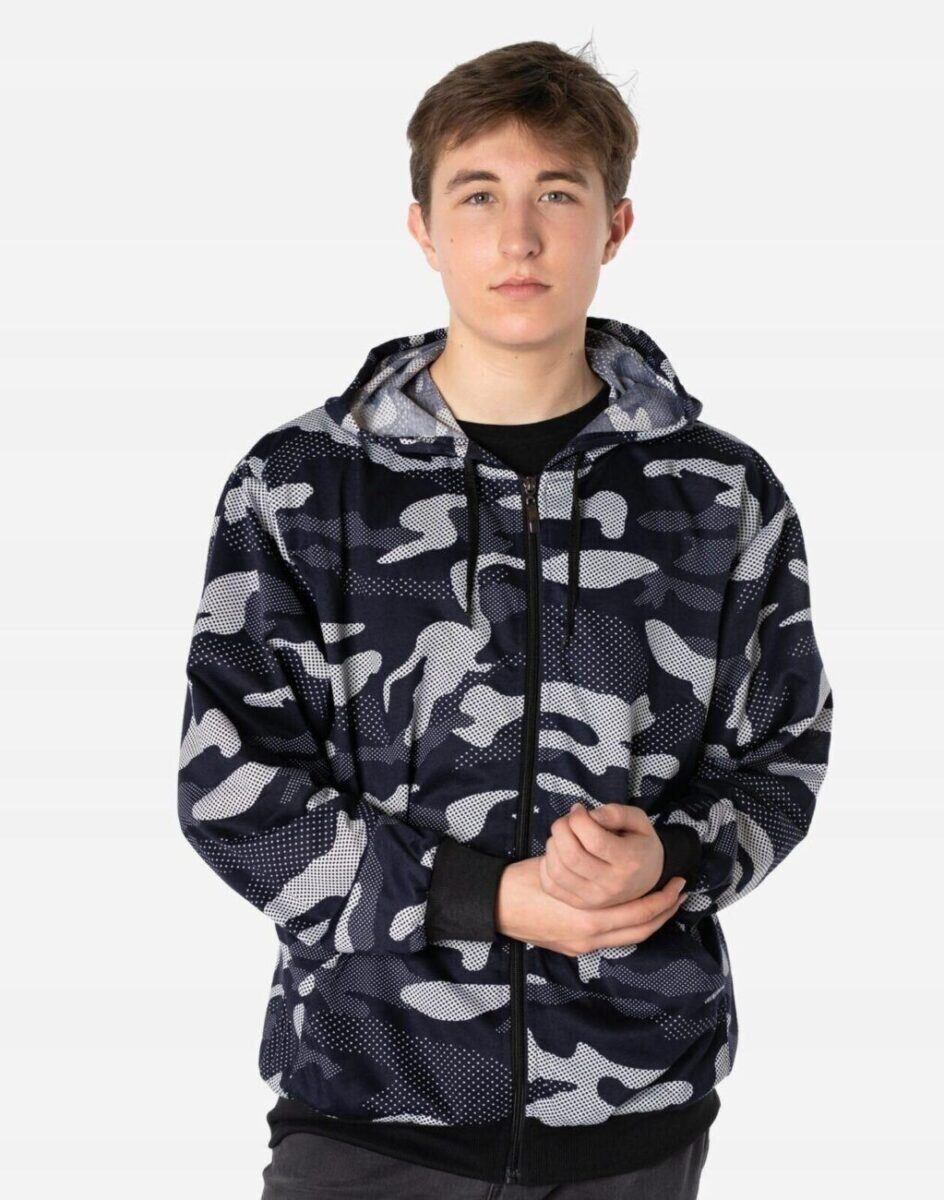 Bluza zasuwana jest w całości na zamek błyskawiczny, posiada dwie naszywane kieszenie na dłonie oraz praktyczny, regulowany kaptur. Rękawy i dół bluzy wykończone są szerokim elastycznym ściągaczem. Wykonana z wysokiej jakości cienkiej dzianiny bawełnianej o gęstości (190 g/m2 ) z dodatkiem poliestru. Naturalna bawełna gwarantuje izolację cieplną, wchłanianie potu i oddychanie skóry a dodatek poliestru to gwarancja pełnej swobody ruchów oraz stabilności rozmiarów i kolorów po wielokrotnym praniu. Ergonomiczny krój bluzy nie ogranicza swobody ruchów, a właściwe dla odzieży sportowej proporcje surowcowe i niewielka gramatura wpływają pozytywnie na komfort użytkowania. Zewnętrzna powierzchnia bluzy jest ozdobiona w deseń inspirowany wojskowym wzorem moro CAMO, który znają wszyscy na świecie. Ten charakterystyczny wzór jest uwielbiany przez fanów i fanki militarnego stylu ubierania. Możesz w niej chodzić na co dzień, idealnie nadaje się również do uprawiania różnych dyscyplin sportu i rekreacji.
