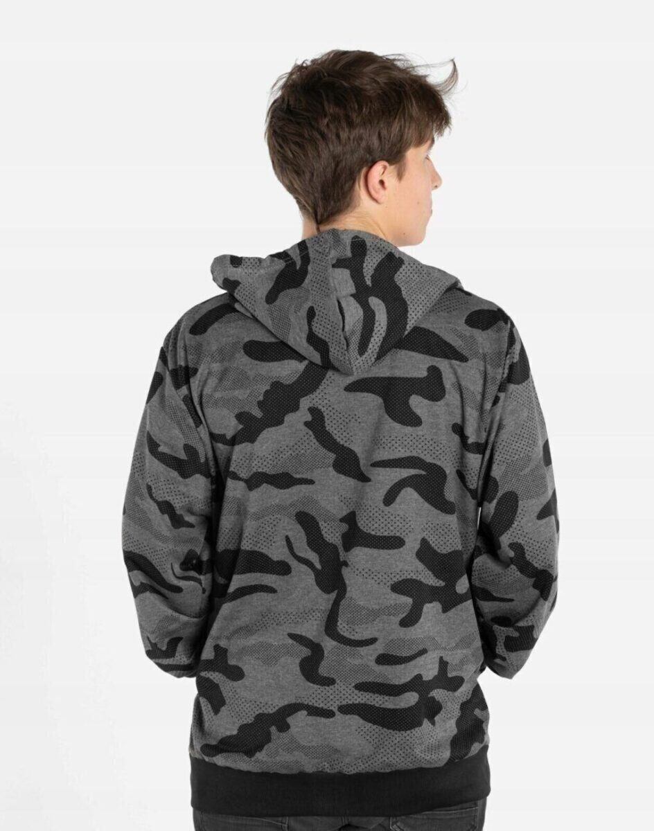 Bluza zasuwana jest w całości na zamek błyskawiczny, posiada dwie naszywane kieszenie na dłonie oraz praktyczny, regulowany kaptur. Rękawy i dół bluzy wykończone są szerokim elastycznym ściągaczem. Wykonana z wysokiej jakości cienkiej dzianiny bawełnianej o gęstości (190 g/m2 ) z dodatkiem poliestru. Naturalna bawełna gwarantuje izolację cieplną, wchłanianie potu i oddychanie skóry a dodatek poliestru to gwarancja pełnej swobody ruchów oraz stabilności rozmiarów i kolorów po wielokrotnym praniu. Ergonomiczny krój bluzy nie ogranicza swobody ruchów, a właściwe dla odzieży sportowej proporcje surowcowe i niewielka gramatura wpływają pozytywnie na komfort użytkowania. Zewnętrzna powierzchnia bluzy jest ozdobiona w deseń inspirowany wojskowym wzorem moro CAMO, który znają wszyscy na świecie. Ten charakterystyczny wzór jest uwielbiany przez fanów i fanki militarnego stylu ubierania. Możesz w niej chodzić na co dzień, idealnie nadaje się również do uprawiania różnych dyscyplin sportu i rekreacji.
