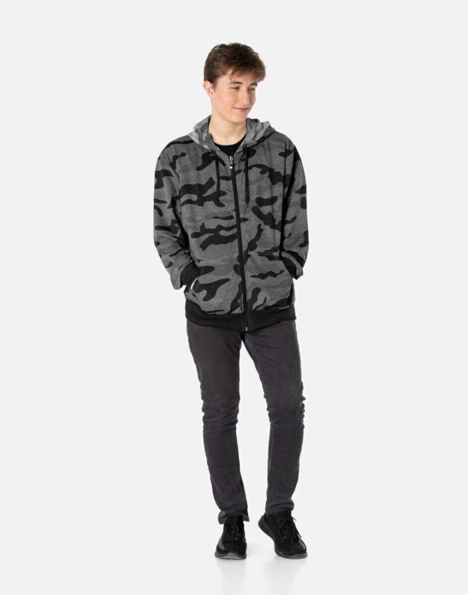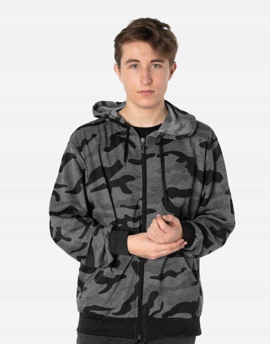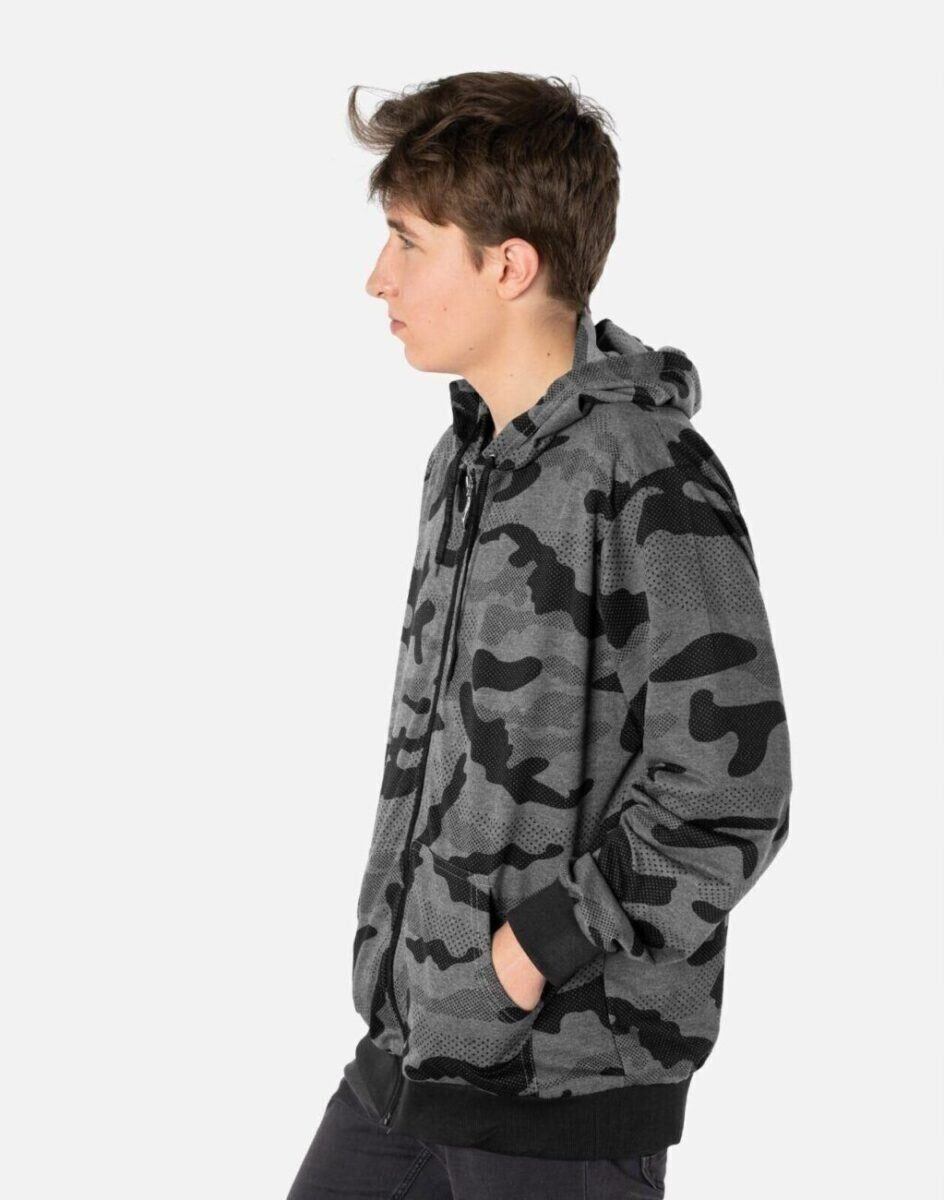 Bluza zasuwana jest w całości na zamek błyskawiczny, posiada dwie naszywane kieszenie na dłonie oraz praktyczny, regulowany kaptur. Rękawy i dół bluzy wykończone są szerokim elastycznym ściągaczem. Wykonana z wysokiej jakości cienkiej dzianiny bawełnianej o gęstości (190 g/m2 ) z dodatkiem poliestru. Naturalna bawełna gwarantuje izolację cieplną, wchłanianie potu i oddychanie skóry a dodatek poliestru to gwarancja pełnej swobody ruchów oraz stabilności rozmiarów i kolorów po wielokrotnym praniu. Ergonomiczny krój bluzy nie ogranicza swobody ruchów, a właściwe dla odzieży sportowej proporcje surowcowe i niewielka gramatura wpływają pozytywnie na komfort użytkowania. Zewnętrzna powierzchnia bluzy jest ozdobiona w deseń inspirowany wojskowym wzorem moro CAMO, który znają wszyscy na świecie. Ten charakterystyczny wzór jest uwielbiany przez fanów i fanki militarnego stylu ubierania. Możesz w niej chodzić na co dzień, idealnie nadaje się również do uprawiania różnych dyscyplin sportu i rekreacji.