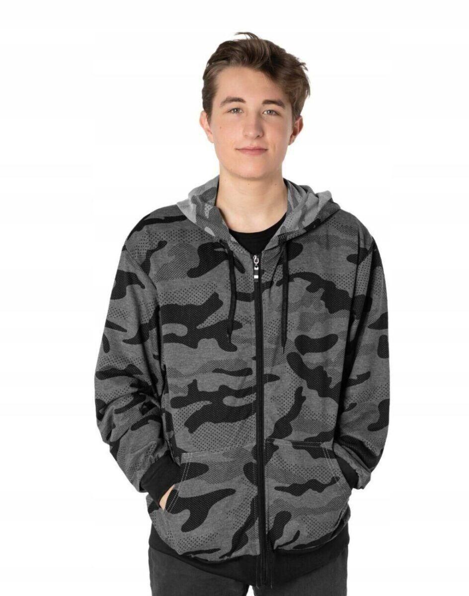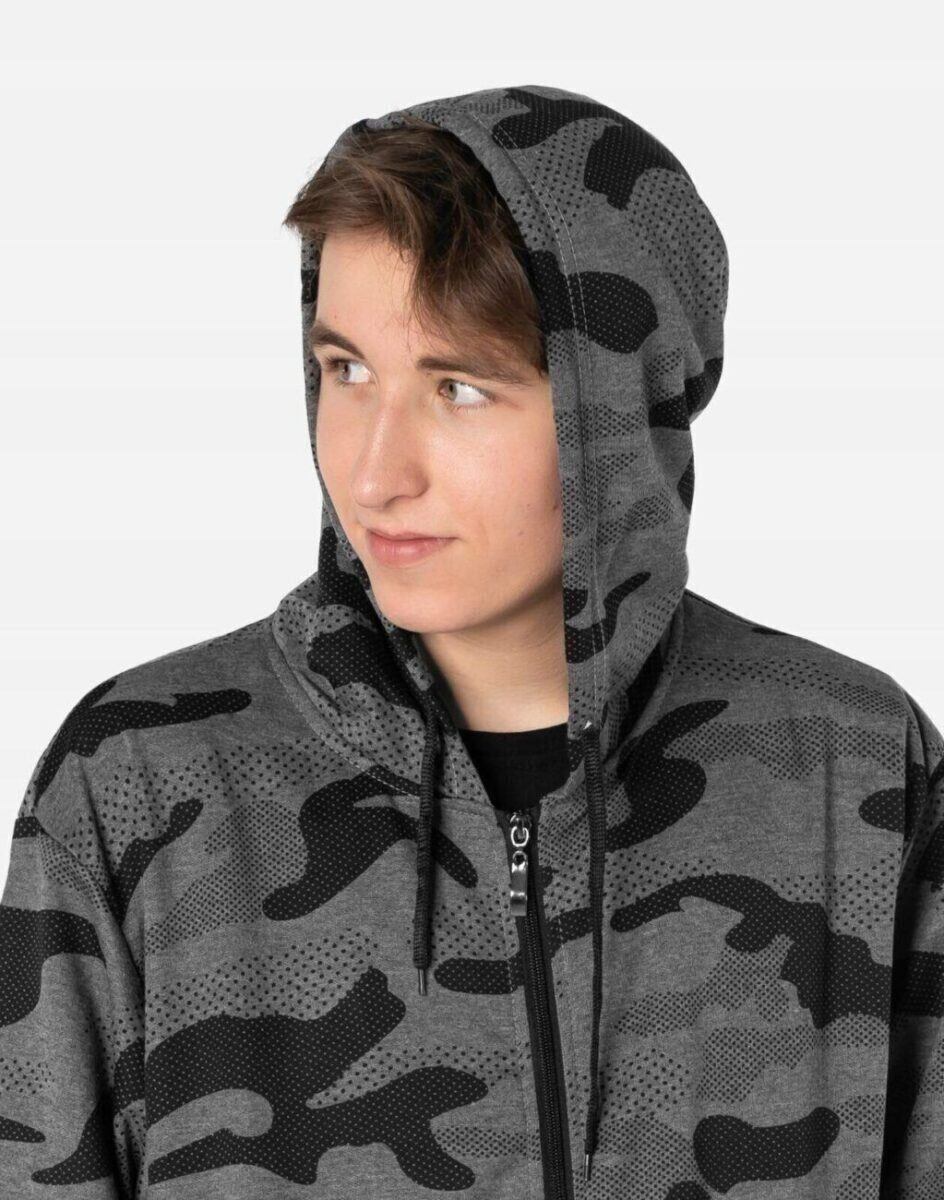 Bluza zasuwana jest w całości na zamek błyskawiczny, posiada dwie naszywane kieszenie na dłonie oraz praktyczny, regulowany kaptur. Rękawy i dół bluzy wykończone są szerokim elastycznym ściągaczem. Wykonana z wysokiej jakości cienkiej dzianiny bawełnianej o gęstości (190 g/m2 ) z dodatkiem poliestru. Naturalna bawełna gwarantuje izolację cieplną, wchłanianie potu i oddychanie skóry a dodatek poliestru to gwarancja pełnej swobody ruchów oraz stabilności rozmiarów i kolorów po wielokrotnym praniu. Ergonomiczny krój bluzy nie ogranicza swobody ruchów, a właściwe dla odzieży sportowej proporcje surowcowe i niewielka gramatura wpływają pozytywnie na komfort użytkowania. Zewnętrzna powierzchnia bluzy jest ozdobiona w deseń inspirowany wojskowym wzorem moro CAMO, który znają wszyscy na świecie. Ten charakterystyczny wzór jest uwielbiany przez fanów i fanki militarnego stylu ubierania. Możesz w niej chodzić na co dzień, idealnie nadaje się również do uprawiania różnych dyscyplin sportu i rekreacji.