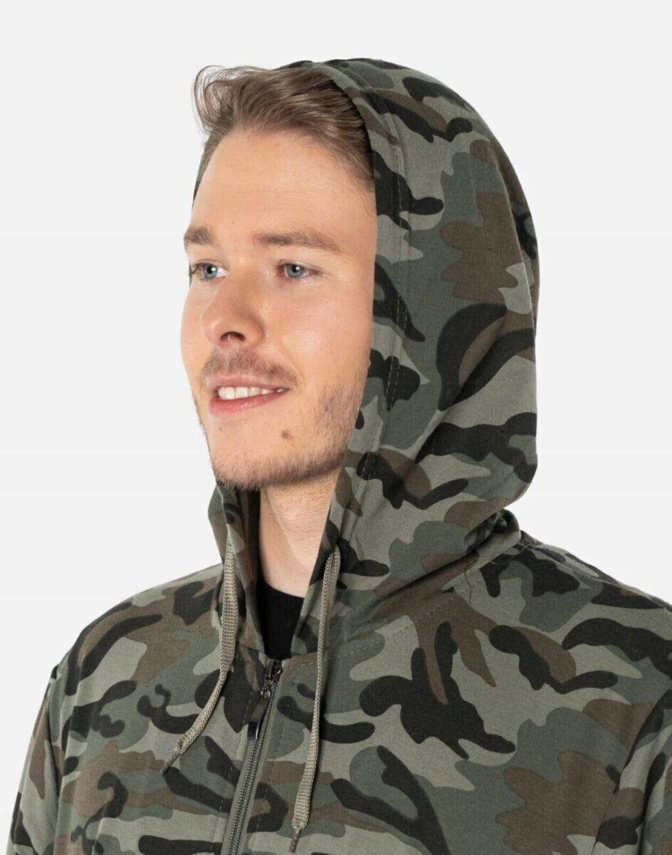 Bluza zasuwana jest w całości na zamek błyskawiczny i posiada dwie wpuszczane kieszenie na dłonie zasuwane na zamki błyskawiczne oraz praktyczny, regulowany kaptur. Rękawy i dół bluzy wykończone są szerokim elastycznym ściągaczem. Wykonana z wysokiej jakości cienkiej dzianiny bawełnianej o gęstości (260 g/m2 ) z dodatkiem poliestru. Naturalna bawełna gwarantuje izolację cieplną, wchłanianie potu i oddychanie skóry a dodatek poliestru to gwarancja pełnej swobody ruchów oraz stabilności rozmiarów i kolorów po wielokrotnym praniu. Ergonomiczny krój bluzy nie ogranicza swobody ruchów, a właściwe dla odzieży sportowej proporcje surowcowe i niewielka gramatura wpływają pozytywnie na komfort użytkowania. Zewnętrzna powierzchnia bluzy jest ozdobiona w deseń inspirowany wojskowym wzorem moro CAMO, który znają wszyscy na świecie. Ten charakterystyczny wzór jest uwielbiany przez fanów i fanki militarnego stylu ubierania. Możesz w niej chodzić na co dzień, idealnie nadaje się również do uprawiania różnych dyscyplin sportu i rekreacji.