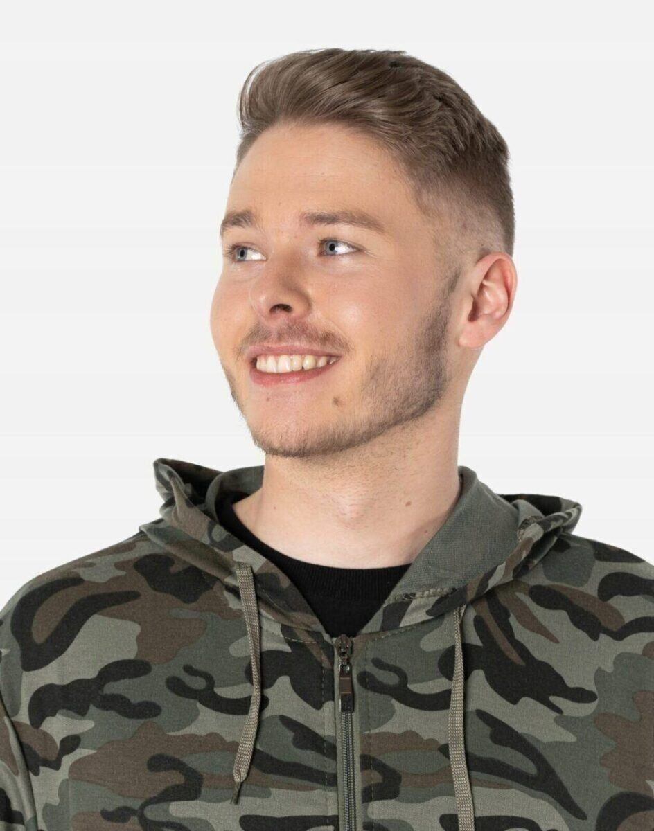 Bluza zasuwana jest w całości na zamek błyskawiczny i posiada dwie wpuszczane kieszenie na dłonie zasuwane na zamki błyskawiczne oraz praktyczny, regulowany kaptur. Rękawy i dół bluzy wykończone są szerokim elastycznym ściągaczem. Wykonana z wysokiej jakości cienkiej dzianiny bawełnianej o gęstości (260 g/m2 ) z dodatkiem poliestru. Naturalna bawełna gwarantuje izolację cieplną, wchłanianie potu i oddychanie skóry a dodatek poliestru to gwarancja pełnej swobody ruchów oraz stabilności rozmiarów i kolorów po wielokrotnym praniu. Ergonomiczny krój bluzy nie ogranicza swobody ruchów, a właściwe dla odzieży sportowej proporcje surowcowe i niewielka gramatura wpływają pozytywnie na komfort użytkowania. Zewnętrzna powierzchnia bluzy jest ozdobiona w deseń inspirowany wojskowym wzorem moro CAMO, który znają wszyscy na świecie. Ten charakterystyczny wzór jest uwielbiany przez fanów i fanki militarnego stylu ubierania. Możesz w niej chodzić na co dzień, idealnie nadaje się również do uprawiania różnych dyscyplin sportu i rekreacji.