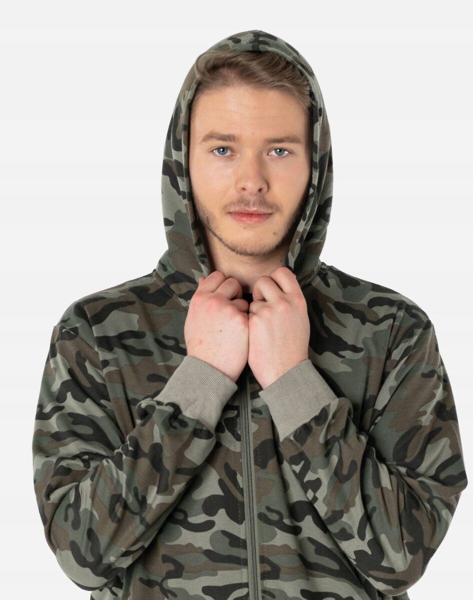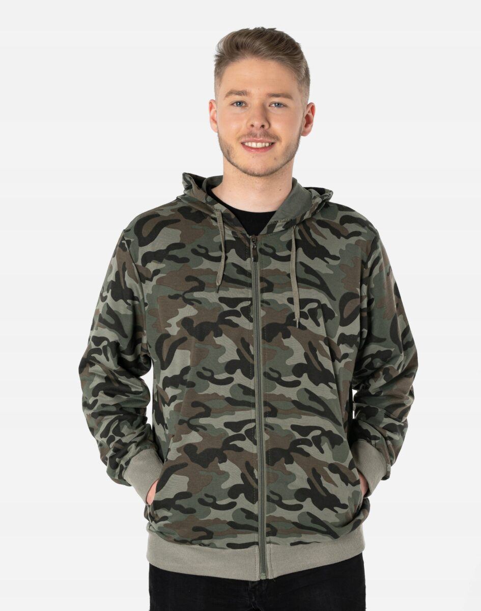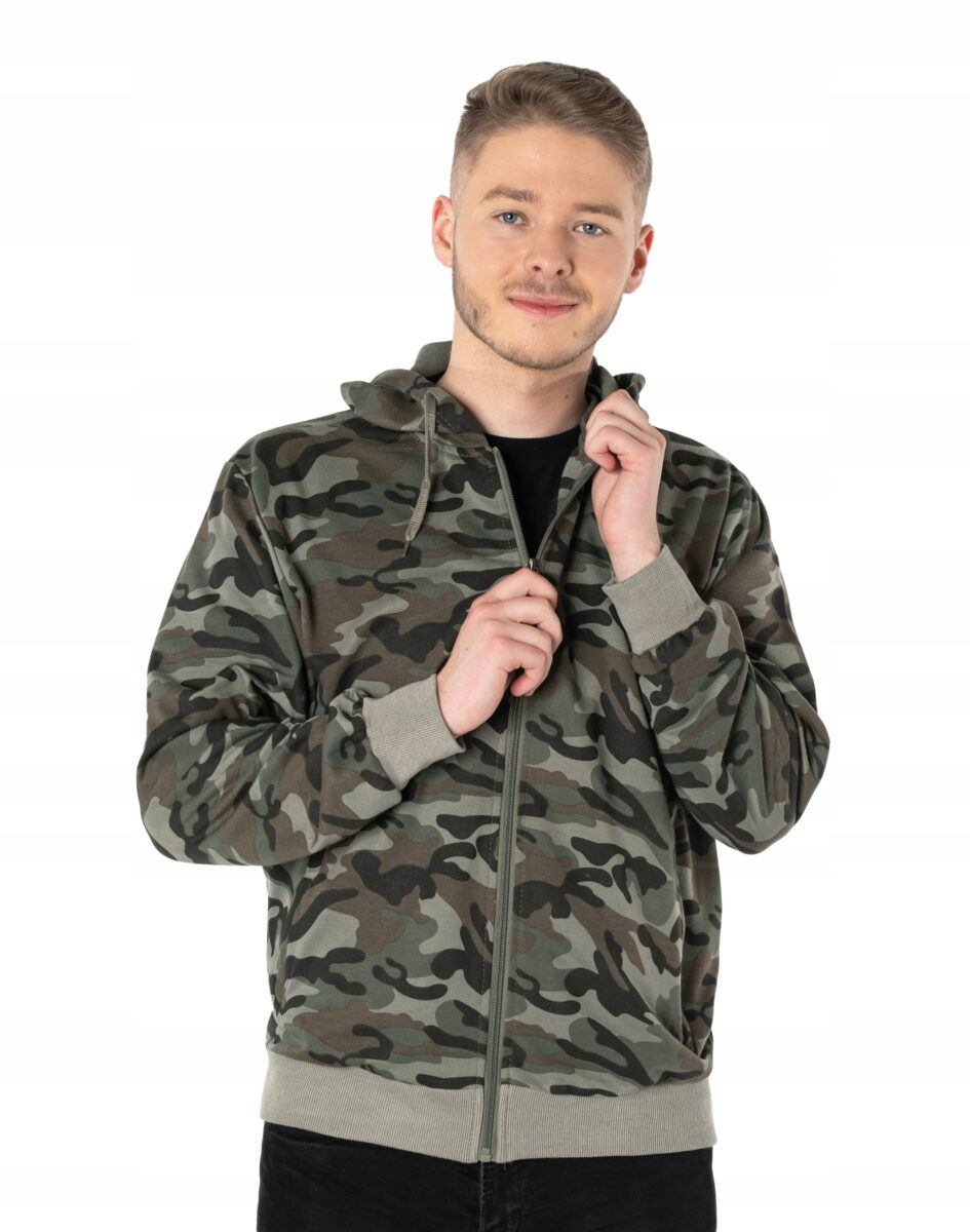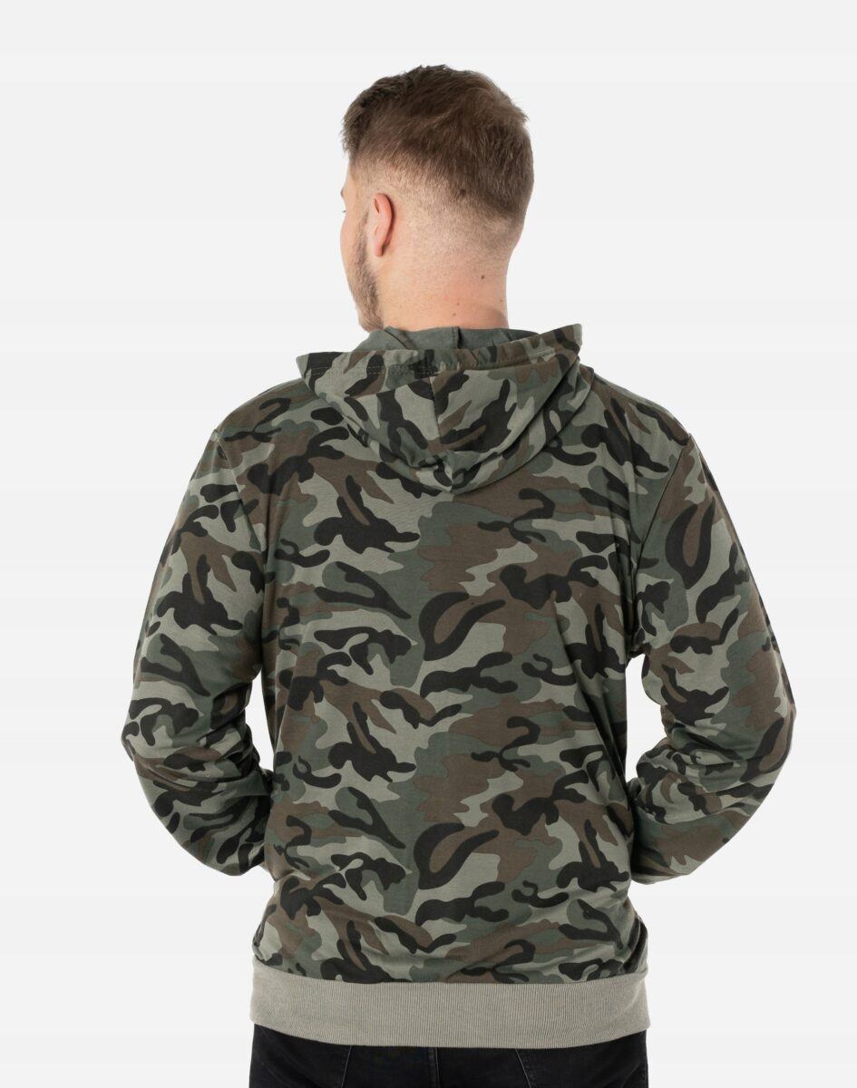 Bluza zasuwana jest w całości na zamek błyskawiczny i posiada dwie wpuszczane kieszenie na dłonie zasuwane na zamki błyskawiczne oraz praktyczny, regulowany kaptur. Rękawy i dół bluzy wykończone są szerokim elastycznym ściągaczem. Wykonana z wysokiej jakości cienkiej dzianiny bawełnianej o gęstości (260 g/m2 ) z dodatkiem poliestru. Naturalna bawełna gwarantuje izolację cieplną, wchłanianie potu i oddychanie skóry a dodatek poliestru to gwarancja pełnej swobody ruchów oraz stabilności rozmiarów i kolorów po wielokrotnym praniu. Ergonomiczny krój bluzy nie ogranicza swobody ruchów, a właściwe dla odzieży sportowej proporcje surowcowe i niewielka gramatura wpływają pozytywnie na komfort użytkowania. Zewnętrzna powierzchnia bluzy jest ozdobiona w deseń inspirowany wojskowym wzorem moro CAMO, który znają wszyscy na świecie. Ten charakterystyczny wzór jest uwielbiany przez fanów i fanki militarnego stylu ubierania. Możesz w niej chodzić na co dzień, idealnie nadaje się również do uprawiania różnych dyscyplin sportu i rekreacji.