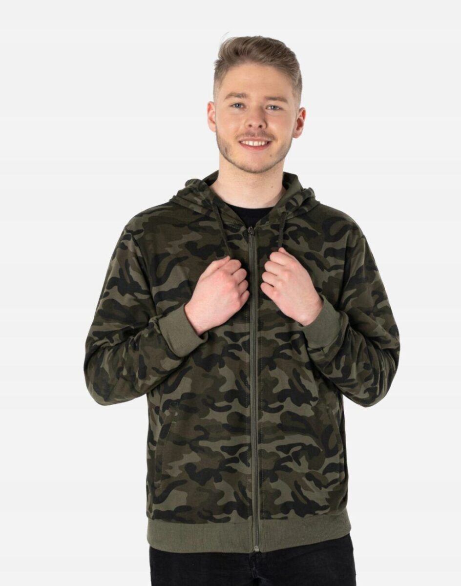 Bluza zasuwana jest w całości na zamek błyskawiczny i posiada dwie wpuszczane kieszenie na dłonie zasuwane na zamki błyskawiczne oraz praktyczny, regulowany kaptur. Rękawy i dół bluzy wykończone są szerokim elastycznym ściągaczem. Wykonana z wysokiej jakości cienkiej dzianiny bawełnianej o gęstości (260 g/m2 ) z dodatkiem poliestru. Naturalna bawełna gwarantuje izolację cieplną, wchłanianie potu i oddychanie skóry a dodatek poliestru to gwarancja pełnej swobody ruchów oraz stabilności rozmiarów i kolorów po wielokrotnym praniu. Ergonomiczny krój bluzy nie ogranicza swobody ruchów, a właściwe dla odzieży sportowej proporcje surowcowe i niewielka gramatura wpływają pozytywnie na komfort użytkowania. Zewnętrzna powierzchnia bluzy jest ozdobiona w deseń inspirowany wojskowym wzorem moro CAMO, który znają wszyscy na świecie. Ten charakterystyczny wzór jest uwielbiany przez fanów i fanki militarnego stylu ubierania. Możesz w niej chodzić na co dzień, idealnie nadaje się również do uprawiania różnych dyscyplin sportu i rekreacji.