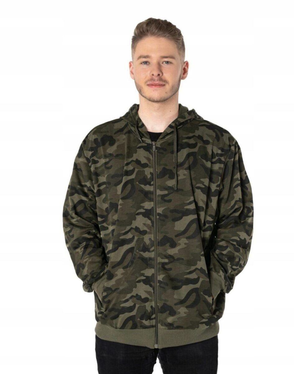 Bluza zasuwana jest w całości na zamek błyskawiczny i posiada dwie wpuszczane kieszenie na dłonie zasuwane na zamki błyskawiczne oraz praktyczny, regulowany kaptur. Rękawy i dół bluzy wykończone są szerokim elastycznym ściągaczem. Wykonana z wysokiej jakości cienkiej dzianiny bawełnianej o gęstości (260 g/m2 ) z dodatkiem poliestru. Naturalna bawełna gwarantuje izolację cieplną, wchłanianie potu i oddychanie skóry a dodatek poliestru to gwarancja pełnej swobody ruchów oraz stabilności rozmiarów i kolorów po wielokrotnym praniu. Ergonomiczny krój bluzy nie ogranicza swobody ruchów, a właściwe dla odzieży sportowej proporcje surowcowe i niewielka gramatura wpływają pozytywnie na komfort użytkowania. Zewnętrzna powierzchnia bluzy jest ozdobiona w deseń inspirowany wojskowym wzorem moro CAMO, który znają wszyscy na świecie. Ten charakterystyczny wzór jest uwielbiany przez fanów i fanki militarnego stylu ubierania. Możesz w niej chodzić na co dzień, idealnie nadaje się również do uprawiania różnych dyscyplin sportu i rekreacji.