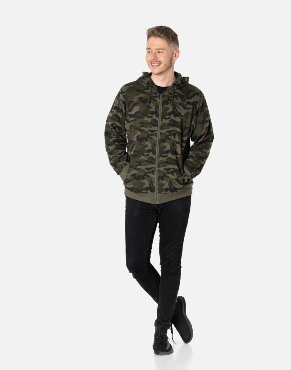 Bluza zasuwana jest w całości na zamek błyskawiczny i posiada dwie wpuszczane kieszenie na dłonie zasuwane na zamki błyskawiczne oraz praktyczny, regulowany kaptur. Rękawy i dół bluzy wykończone są szerokim elastycznym ściągaczem. Wykonana z wysokiej jakości cienkiej dzianiny bawełnianej o gęstości (260 g/m2 ) z dodatkiem poliestru. Naturalna bawełna gwarantuje izolację cieplną, wchłanianie potu i oddychanie skóry a dodatek poliestru to gwarancja pełnej swobody ruchów oraz stabilności rozmiarów i kolorów po wielokrotnym praniu. Ergonomiczny krój bluzy nie ogranicza swobody ruchów, a właściwe dla odzieży sportowej proporcje surowcowe i niewielka gramatura wpływają pozytywnie na komfort użytkowania. Zewnętrzna powierzchnia bluzy jest ozdobiona w deseń inspirowany wojskowym wzorem moro CAMO, który znają wszyscy na świecie. Ten charakterystyczny wzór jest uwielbiany przez fanów i fanki militarnego stylu ubierania. Możesz w niej chodzić na co dzień, idealnie nadaje się również do uprawiania różnych dyscyplin sportu i rekreacji.
