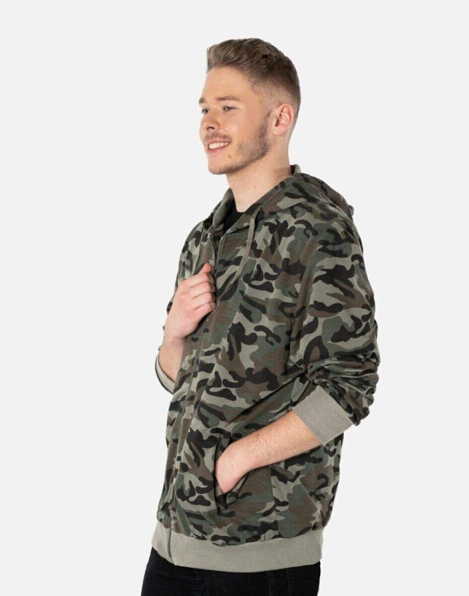 Bluza zasuwana jest w całości na zamek błyskawiczny i posiada dwie wpuszczane kieszenie na dłonie zasuwane na zamki błyskawiczne oraz praktyczny, regulowany kaptur. Rękawy i dół bluzy wykończone są szerokim elastycznym ściągaczem. Wykonana z wysokiej jakości cienkiej dzianiny bawełnianej o gęstości (260 g/m2 ) z dodatkiem poliestru. Naturalna bawełna gwarantuje izolację cieplną, wchłanianie potu i oddychanie skóry a dodatek poliestru to gwarancja pełnej swobody ruchów oraz stabilności rozmiarów i kolorów po wielokrotnym praniu. Ergonomiczny krój bluzy nie ogranicza swobody ruchów, a właściwe dla odzieży sportowej proporcje surowcowe i niewielka gramatura wpływają pozytywnie na komfort użytkowania. Zewnętrzna powierzchnia bluzy jest ozdobiona w deseń inspirowany wojskowym wzorem moro CAMO, który znają wszyscy na świecie. Ten charakterystyczny wzór jest uwielbiany przez fanów i fanki militarnego stylu ubierania. Możesz w niej chodzić na co dzień, idealnie nadaje się również do uprawiania różnych dyscyplin sportu i rekreacji.