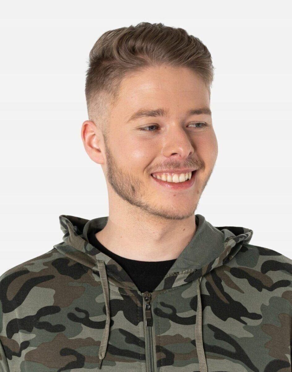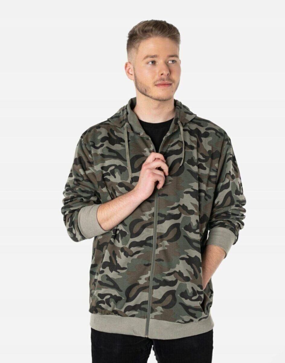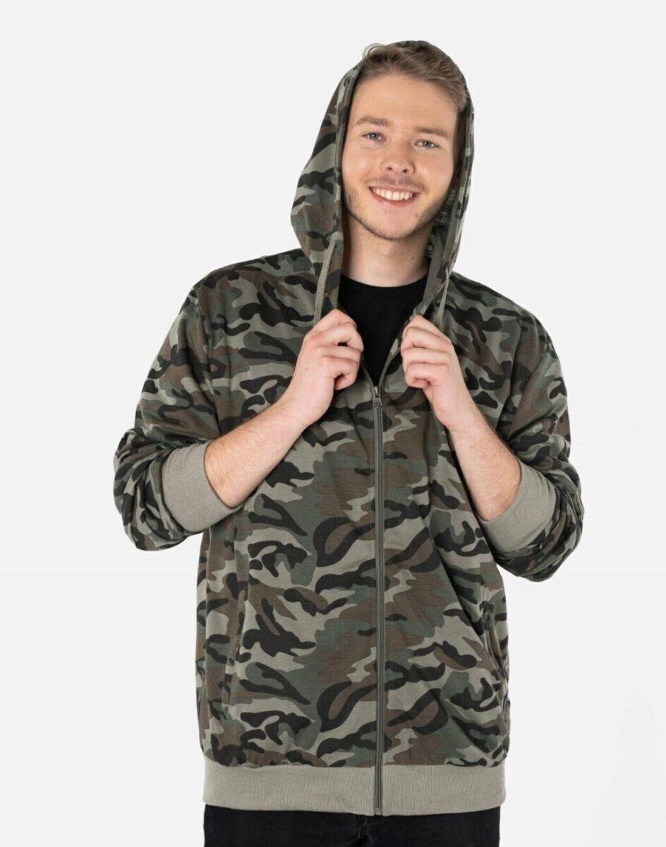 Bluza zasuwana jest w całości na zamek błyskawiczny i posiada dwie wpuszczane kieszenie na dłonie zasuwane na zamki błyskawiczne oraz praktyczny, regulowany kaptur. Rękawy i dół bluzy wykończone są szerokim elastycznym ściągaczem. Wykonana z wysokiej jakości cienkiej dzianiny bawełnianej o gęstości (260 g/m2 ) z dodatkiem poliestru. Naturalna bawełna gwarantuje izolację cieplną, wchłanianie potu i oddychanie skóry a dodatek poliestru to gwarancja pełnej swobody ruchów oraz stabilności rozmiarów i kolorów po wielokrotnym praniu. Ergonomiczny krój bluzy nie ogranicza swobody ruchów, a właściwe dla odzieży sportowej proporcje surowcowe i niewielka gramatura wpływają pozytywnie na komfort użytkowania. Zewnętrzna powierzchnia bluzy jest ozdobiona w deseń inspirowany wojskowym wzorem moro CAMO, który znają wszyscy na świecie. Ten charakterystyczny wzór jest uwielbiany przez fanów i fanki militarnego stylu ubierania. Możesz w niej chodzić na co dzień, idealnie nadaje się również do uprawiania różnych dyscyplin sportu i rekreacji.