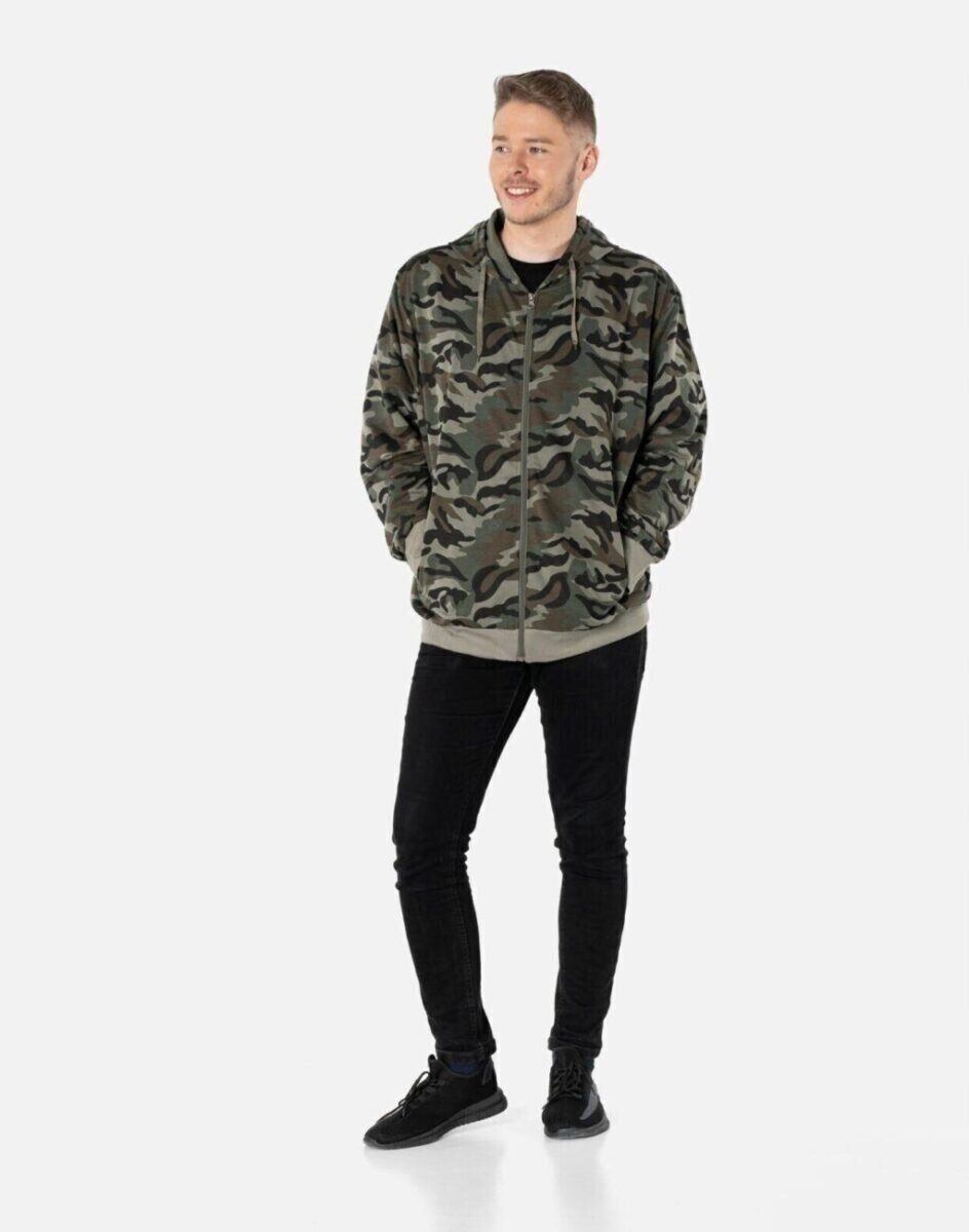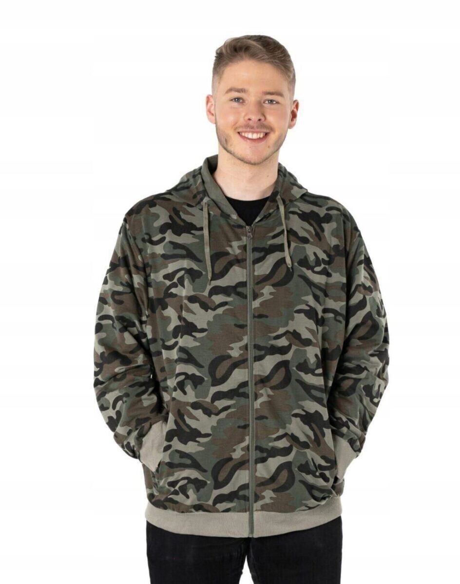 Bluza zasuwana jest w całości na zamek błyskawiczny i posiada dwie wpuszczane kieszenie na dłonie zasuwane na zamki błyskawiczne oraz praktyczny, regulowany kaptur. Rękawy i dół bluzy wykończone są szerokim elastycznym ściągaczem. Wykonana z wysokiej jakości cienkiej dzianiny bawełnianej o gęstości (260 g/m2 ) z dodatkiem poliestru. Naturalna bawełna gwarantuje izolację cieplną, wchłanianie potu i oddychanie skóry a dodatek poliestru to gwarancja pełnej swobody ruchów oraz stabilności rozmiarów i kolorów po wielokrotnym praniu. Ergonomiczny krój bluzy nie ogranicza swobody ruchów, a właściwe dla odzieży sportowej proporcje surowcowe i niewielka gramatura wpływają pozytywnie na komfort użytkowania. Zewnętrzna powierzchnia bluzy jest ozdobiona w deseń inspirowany wojskowym wzorem moro CAMO, który znają wszyscy na świecie. Ten charakterystyczny wzór jest uwielbiany przez fanów i fanki militarnego stylu ubierania. Możesz w niej chodzić na co dzień, idealnie nadaje się również do uprawiania różnych dyscyplin sportu i rekreacji.