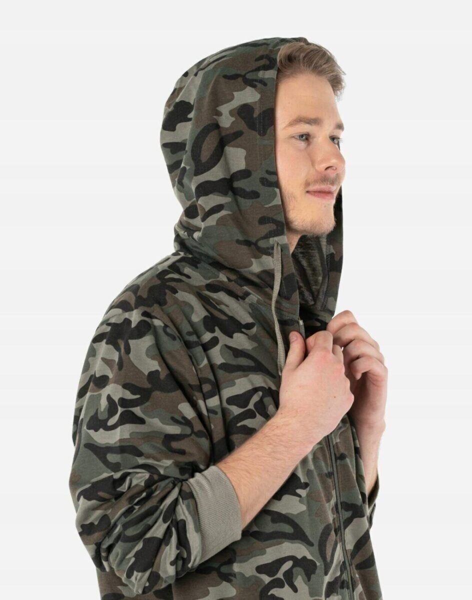 Bluza zasuwana jest w całości na zamek błyskawiczny i posiada dwie wpuszczane kieszenie na dłonie zasuwane na zamki błyskawiczne oraz praktyczny, regulowany kaptur. Rękawy i dół bluzy wykończone są szerokim elastycznym ściągaczem. Wykonana z wysokiej jakości cienkiej dzianiny bawełnianej o gęstości (260 g/m2 ) z dodatkiem poliestru. Naturalna bawełna gwarantuje izolację cieplną, wchłanianie potu i oddychanie skóry a dodatek poliestru to gwarancja pełnej swobody ruchów oraz stabilności rozmiarów i kolorów po wielokrotnym praniu. Ergonomiczny krój bluzy nie ogranicza swobody ruchów, a właściwe dla odzieży sportowej proporcje surowcowe i niewielka gramatura wpływają pozytywnie na komfort użytkowania. Zewnętrzna powierzchnia bluzy jest ozdobiona w deseń inspirowany wojskowym wzorem moro CAMO, który znają wszyscy na świecie. Ten charakterystyczny wzór jest uwielbiany przez fanów i fanki militarnego stylu ubierania. Możesz w niej chodzić na co dzień, idealnie nadaje się również do uprawiania różnych dyscyplin sportu i rekreacji.