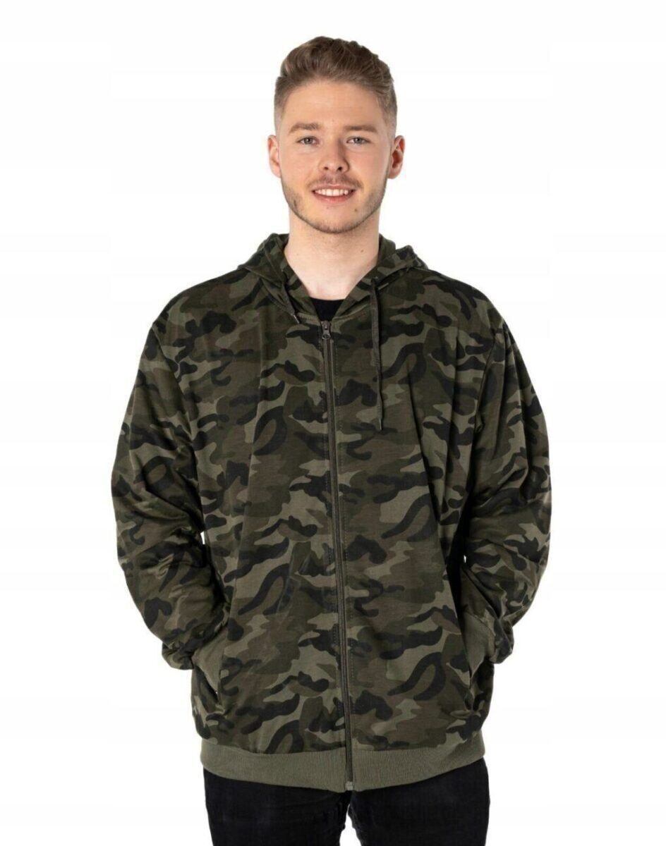 Bluza zasuwana jest w całości na zamek błyskawiczny i posiada dwie wpuszczane kieszenie na dłonie zasuwane na zamki błyskawiczne oraz praktyczny, regulowany kaptur. Rękawy i dół bluzy wykończone są szerokim elastycznym ściągaczem. Wykonana z wysokiej jakości cienkiej dzianiny bawełnianej o gęstości (260 g/m2 ) z dodatkiem poliestru. Naturalna bawełna gwarantuje izolację cieplną, wchłanianie potu i oddychanie skóry a dodatek poliestru to gwarancja pełnej swobody ruchów oraz stabilności rozmiarów i kolorów po wielokrotnym praniu. Ergonomiczny krój bluzy nie ogranicza swobody ruchów, a właściwe dla odzieży sportowej proporcje surowcowe i niewielka gramatura wpływają pozytywnie na komfort użytkowania. Zewnętrzna powierzchnia bluzy jest ozdobiona w deseń inspirowany wojskowym wzorem moro CAMO, który znają wszyscy na świecie. Ten charakterystyczny wzór jest uwielbiany przez fanów i fanki militarnego stylu ubierania. Możesz w niej chodzić na co dzień, idealnie nadaje się również do uprawiania różnych dyscyplin sportu i rekreacji.