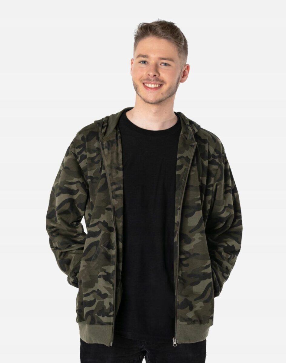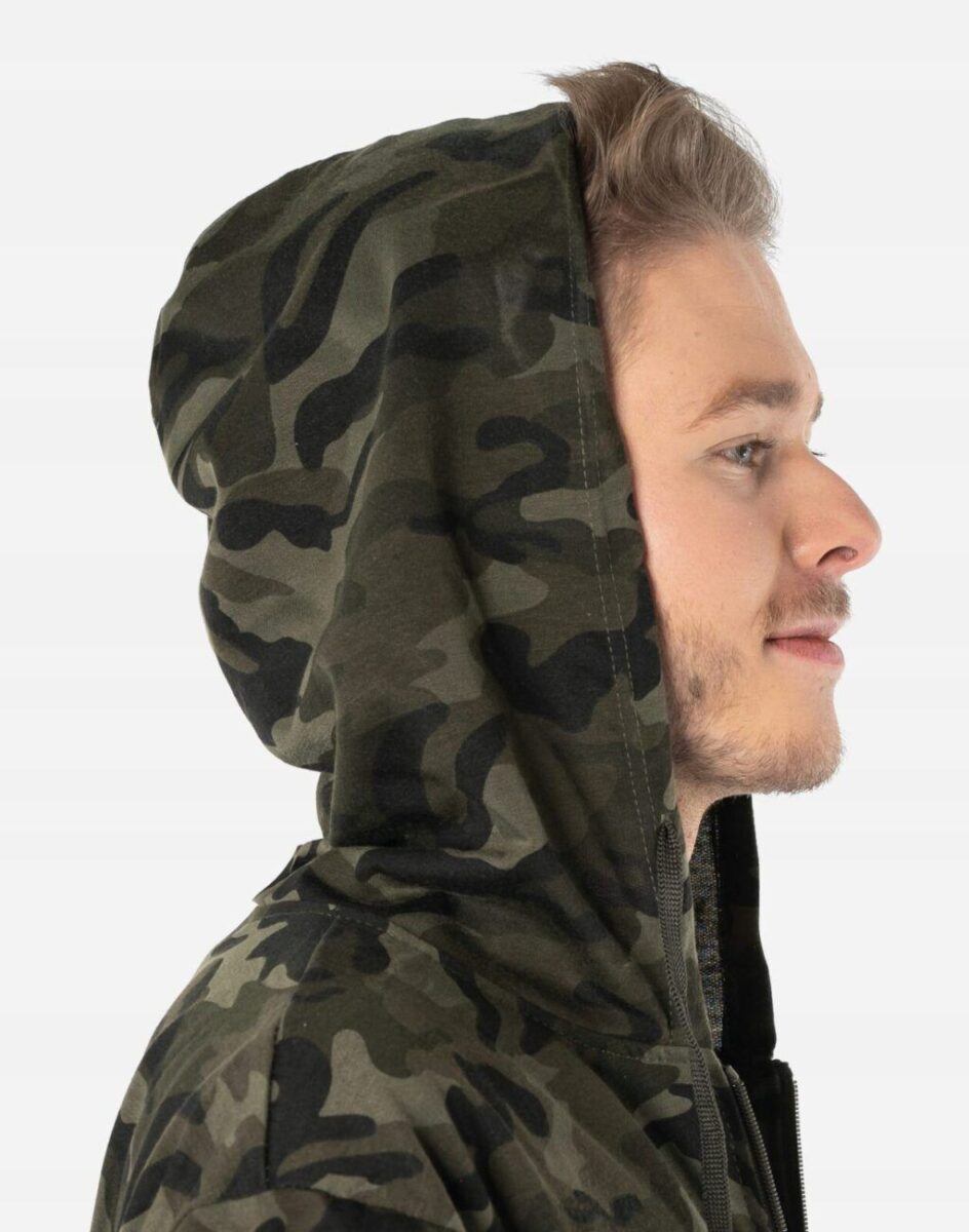 Bluza zasuwana jest w całości na zamek błyskawiczny i posiada dwie wpuszczane kieszenie na dłonie zasuwane na zamki błyskawiczne oraz praktyczny, regulowany kaptur. Rękawy i dół bluzy wykończone są szerokim elastycznym ściągaczem. Wykonana z wysokiej jakości cienkiej dzianiny bawełnianej o gęstości (260 g/m2 ) z dodatkiem poliestru. Naturalna bawełna gwarantuje izolację cieplną, wchłanianie potu i oddychanie skóry a dodatek poliestru to gwarancja pełnej swobody ruchów oraz stabilności rozmiarów i kolorów po wielokrotnym praniu. Ergonomiczny krój bluzy nie ogranicza swobody ruchów, a właściwe dla odzieży sportowej proporcje surowcowe i niewielka gramatura wpływają pozytywnie na komfort użytkowania. Zewnętrzna powierzchnia bluzy jest ozdobiona w deseń inspirowany wojskowym wzorem moro CAMO, który znają wszyscy na świecie. Ten charakterystyczny wzór jest uwielbiany przez fanów i fanki militarnego stylu ubierania. Możesz w niej chodzić na co dzień, idealnie nadaje się również do uprawiania różnych dyscyplin sportu i rekreacji.